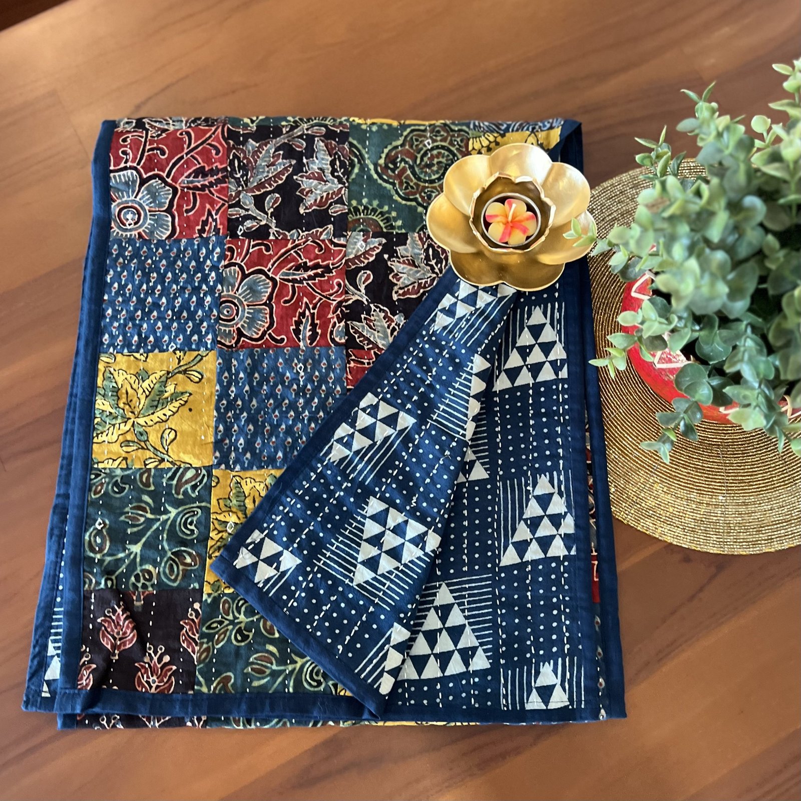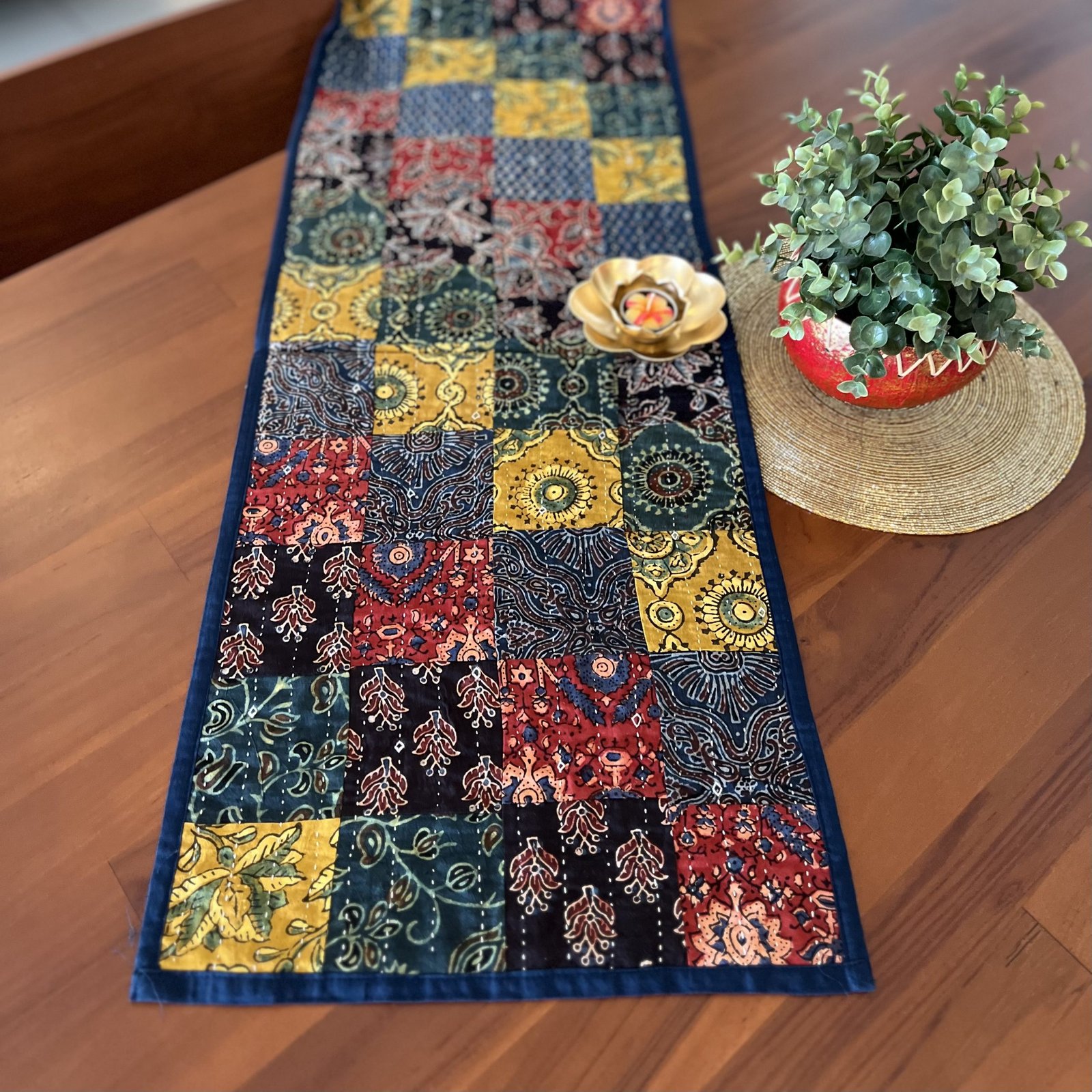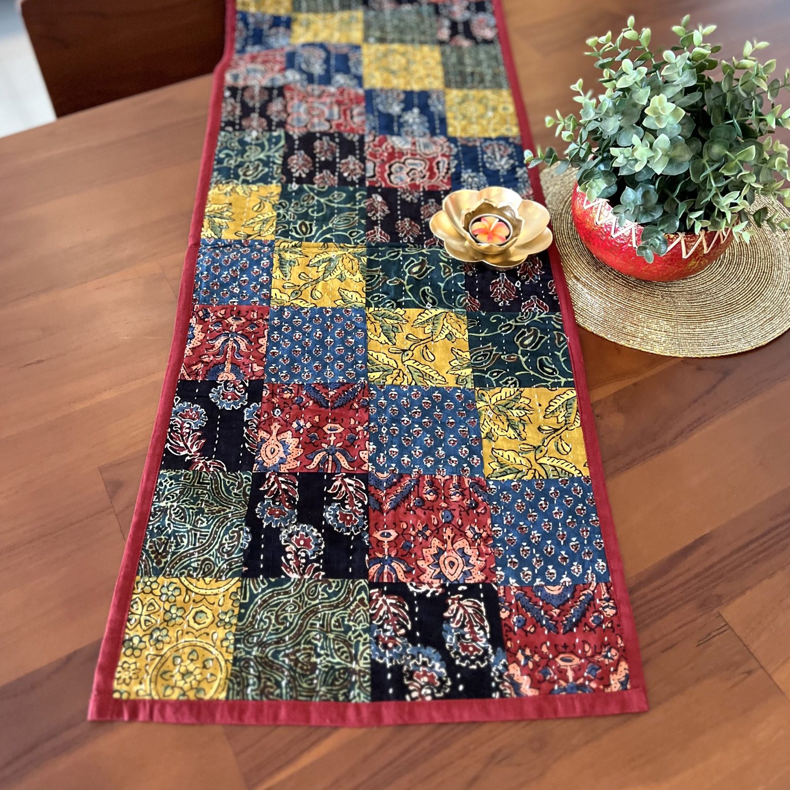Ajrakh Reversible Table Runner & Brass Diya Gift Set (Multicolor, D2)
