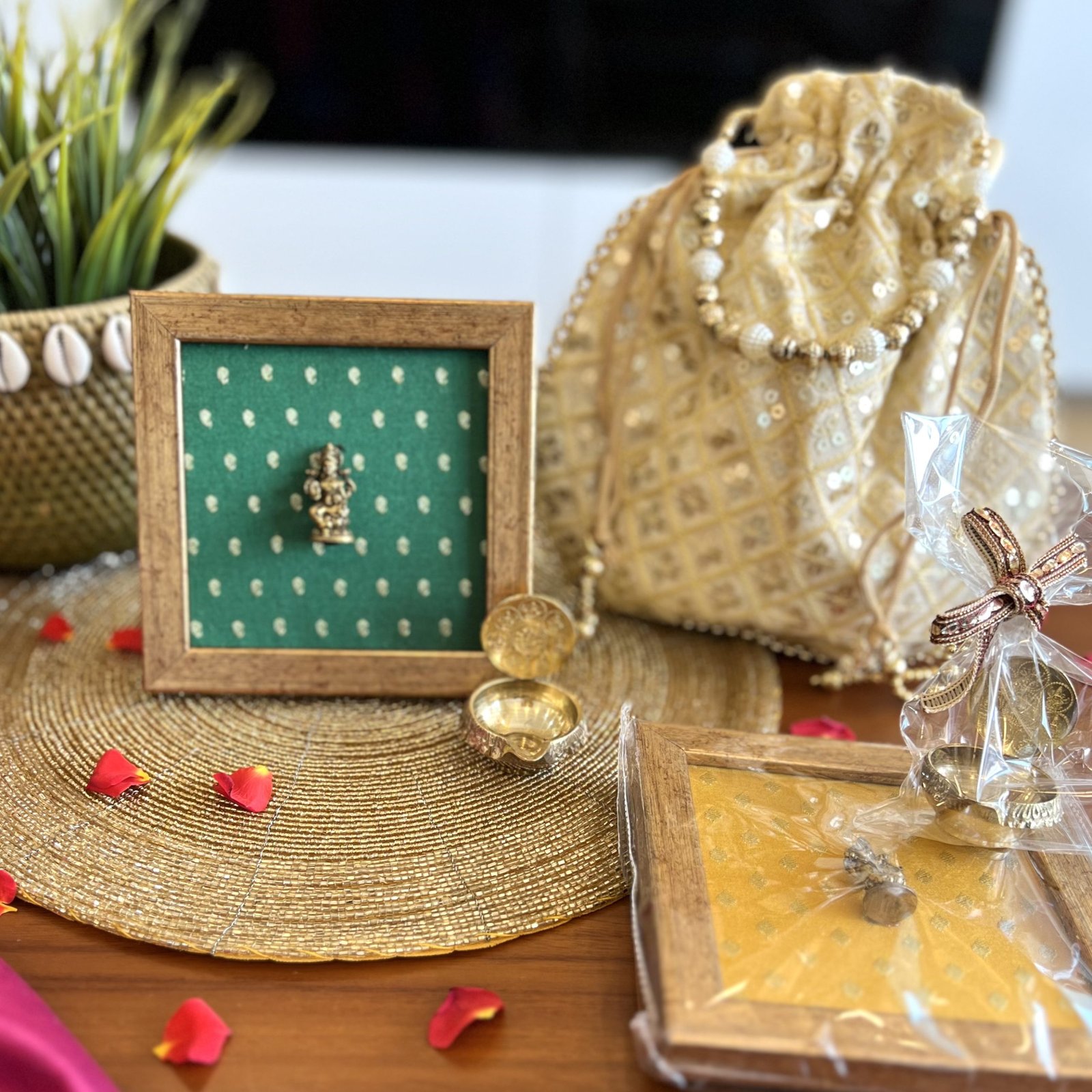 Brass Idol Frame & Diya Gift Set (Lakshmi Green)