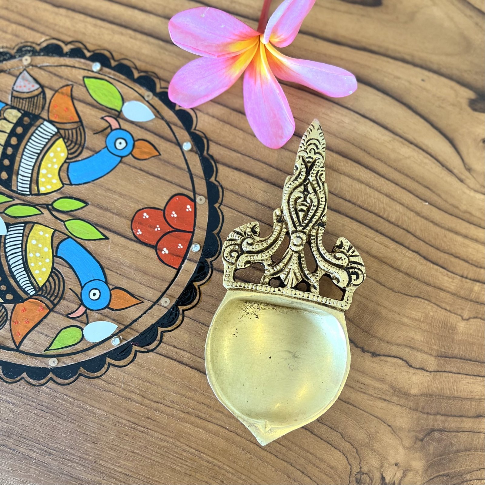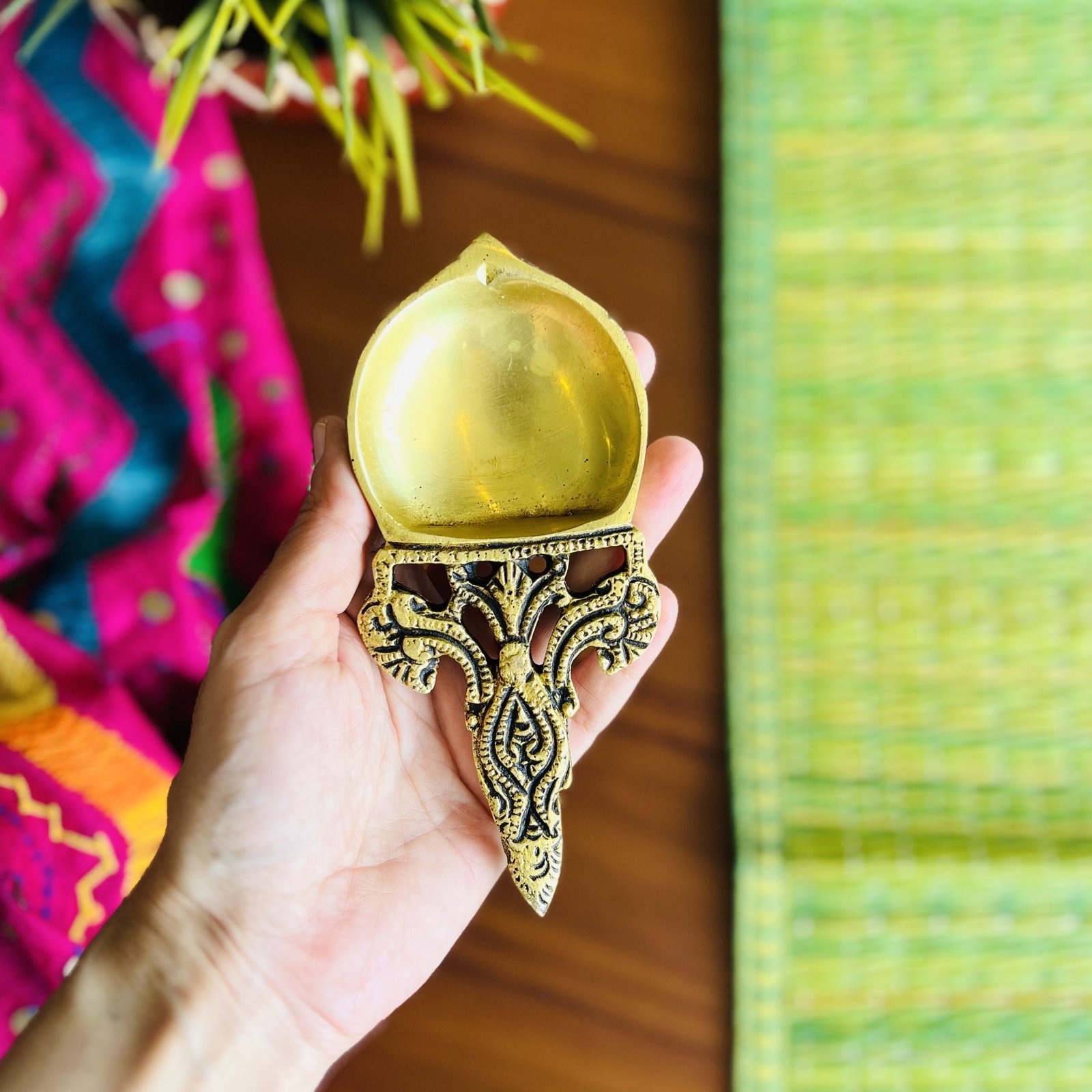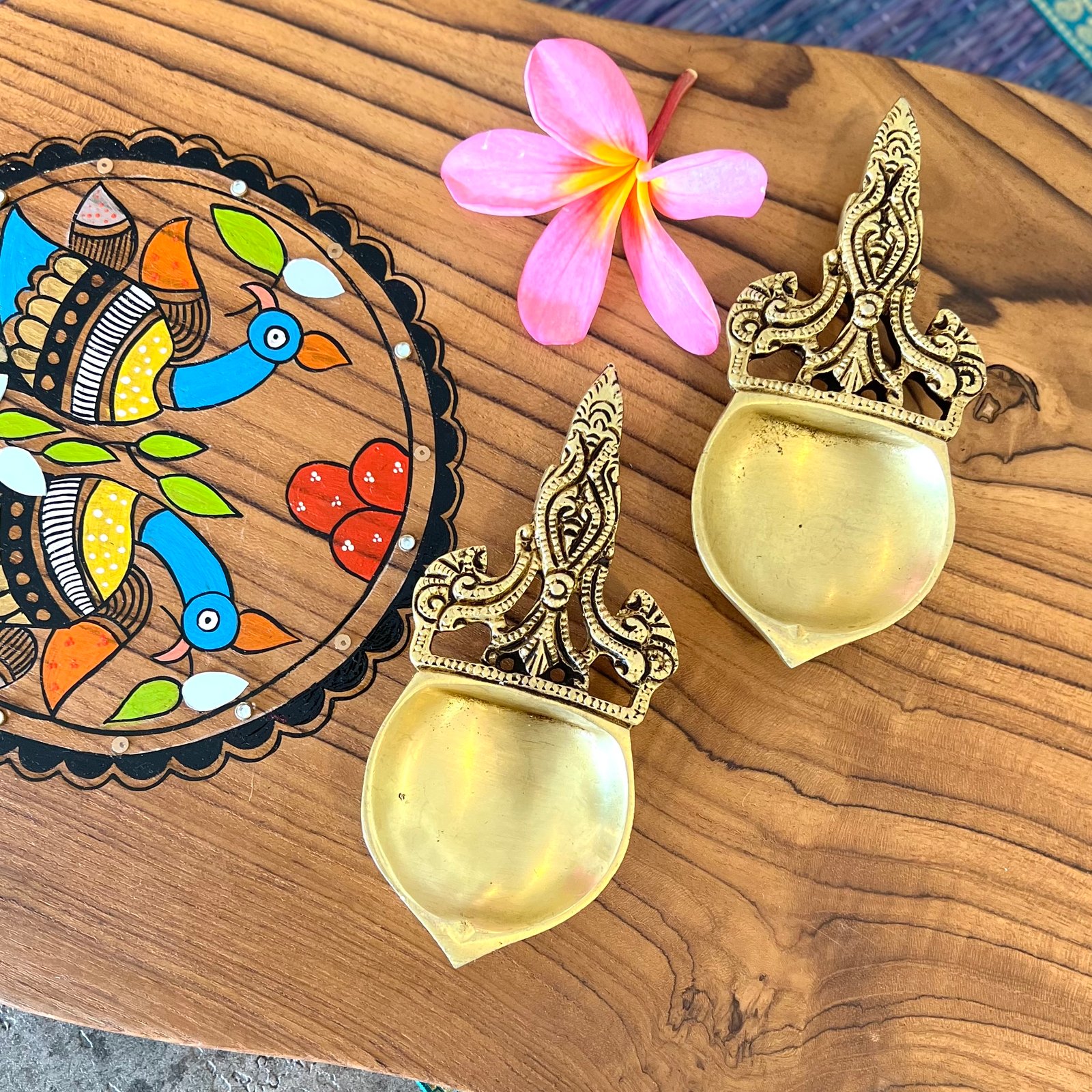 1 brass arti spoon diya: 14.5cm (Length), 6cm (Width), 2cm (Height) Weight: 280-310 grams each
