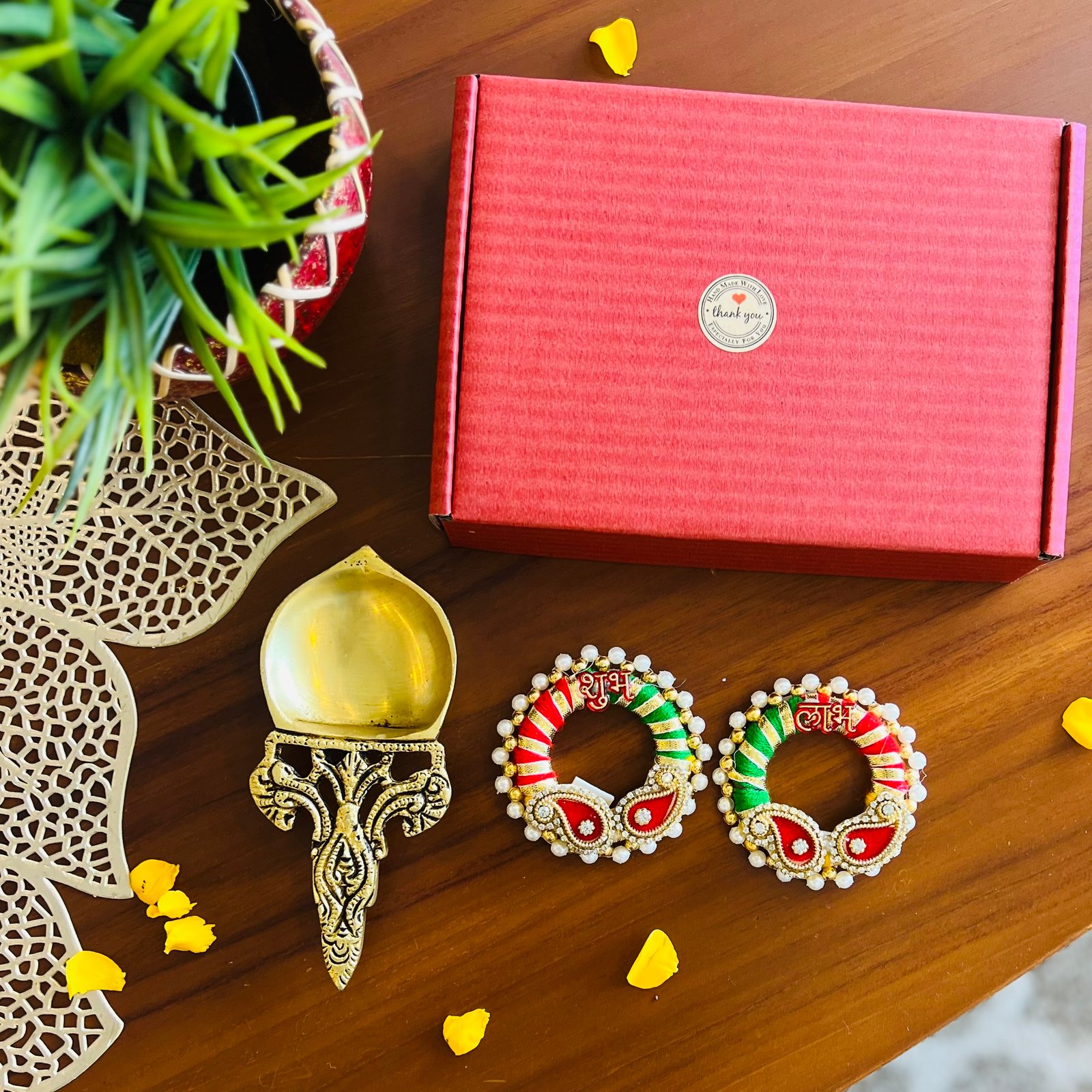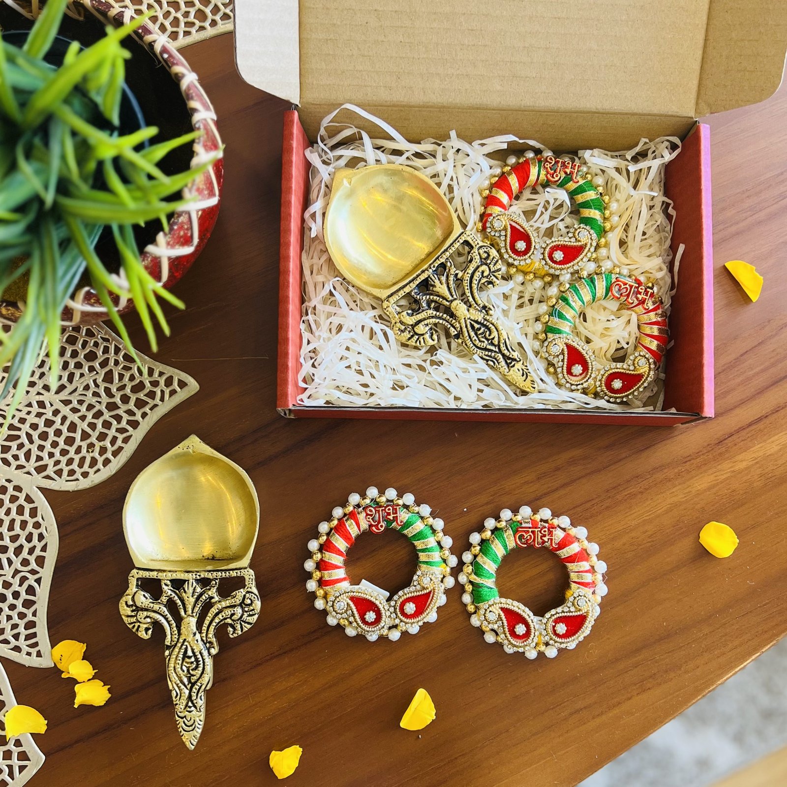 Brass Arti Spoon Diya & Shubh Labh Gift Set