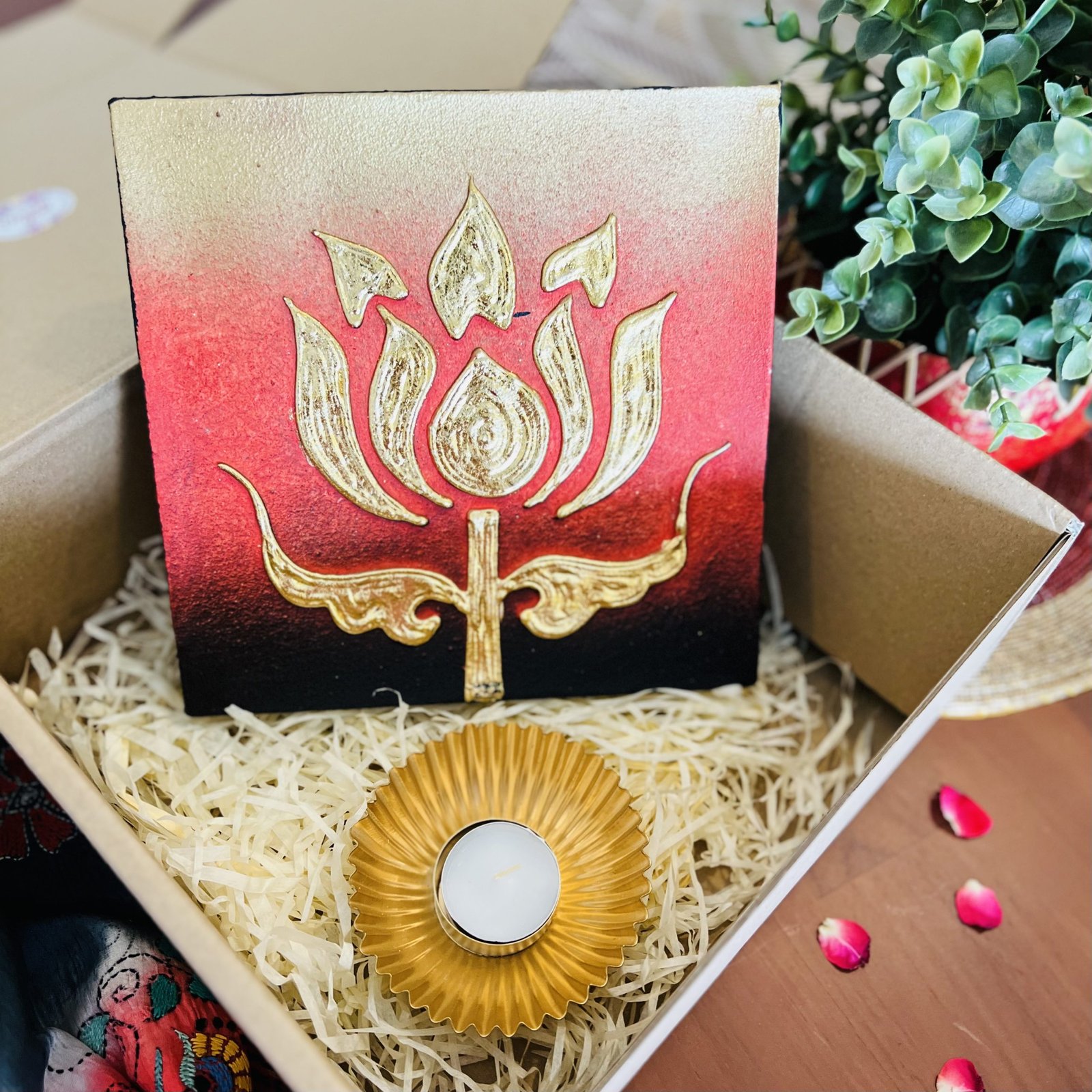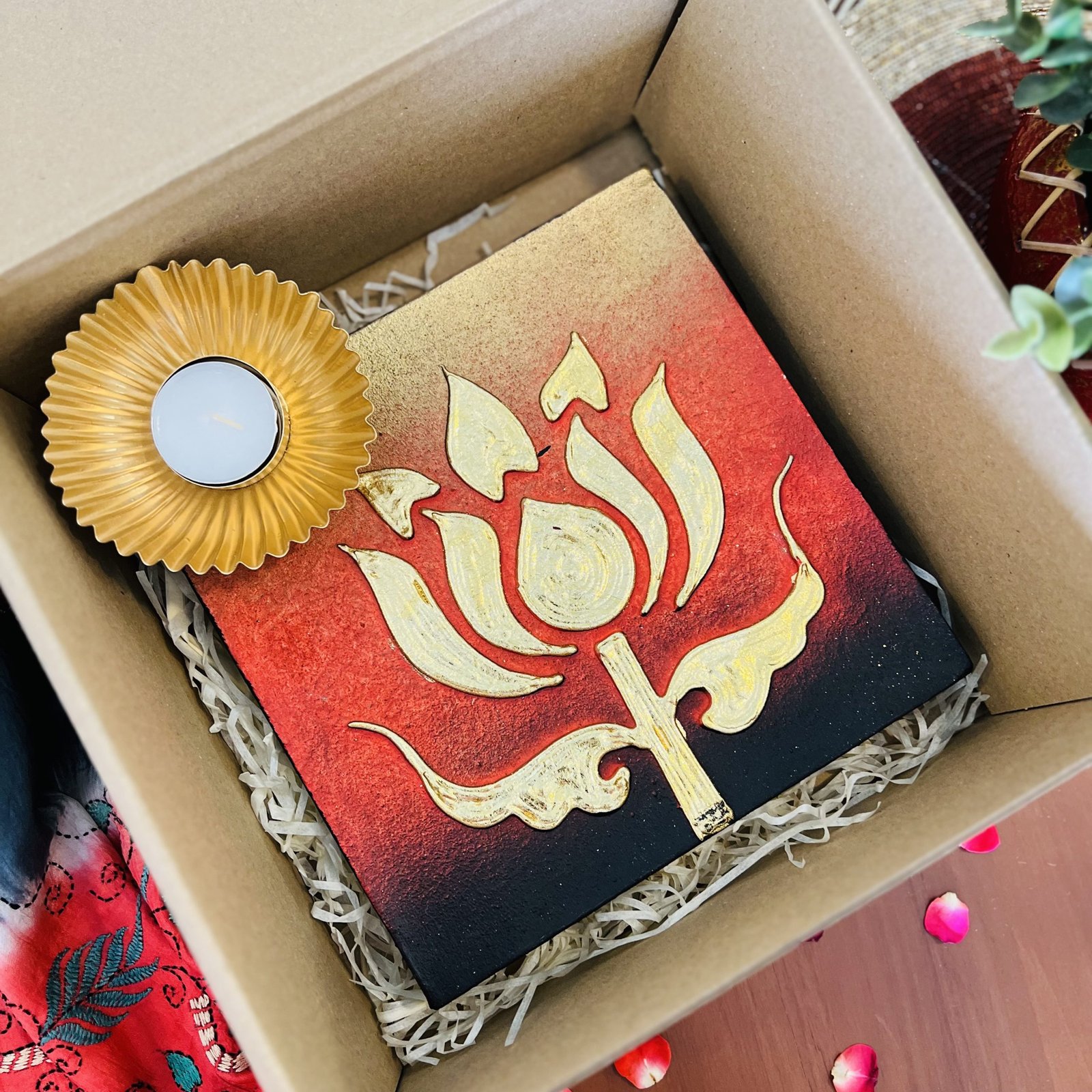 - One Canvas Painting: Dimension – 20x20cm; Material: Acrylic, Gold leaf, Canvas, Solid Wood Frame.