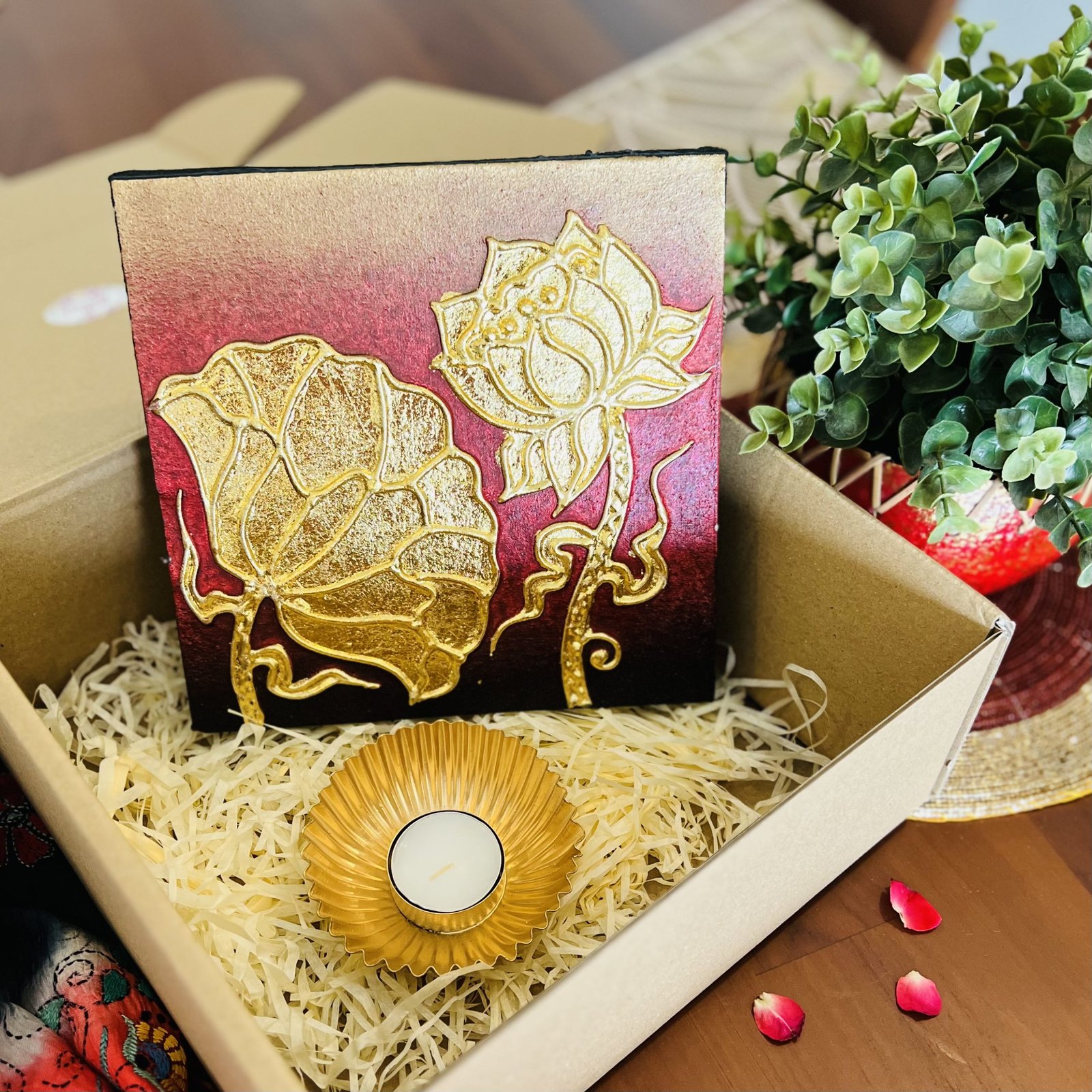 - One Canvas Painting: Dimension – 20x20cm; Material: Acrylic, Gold leaf, Canvas, Solid Wood Frame.