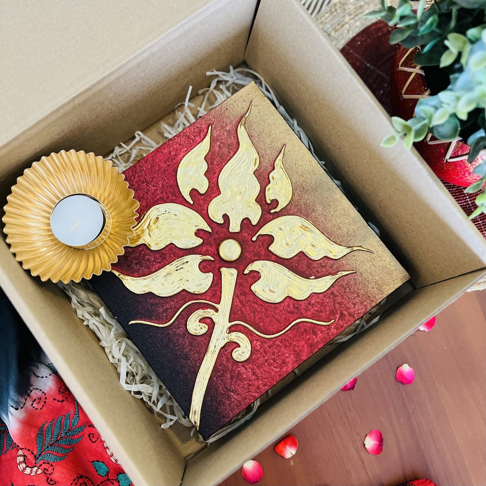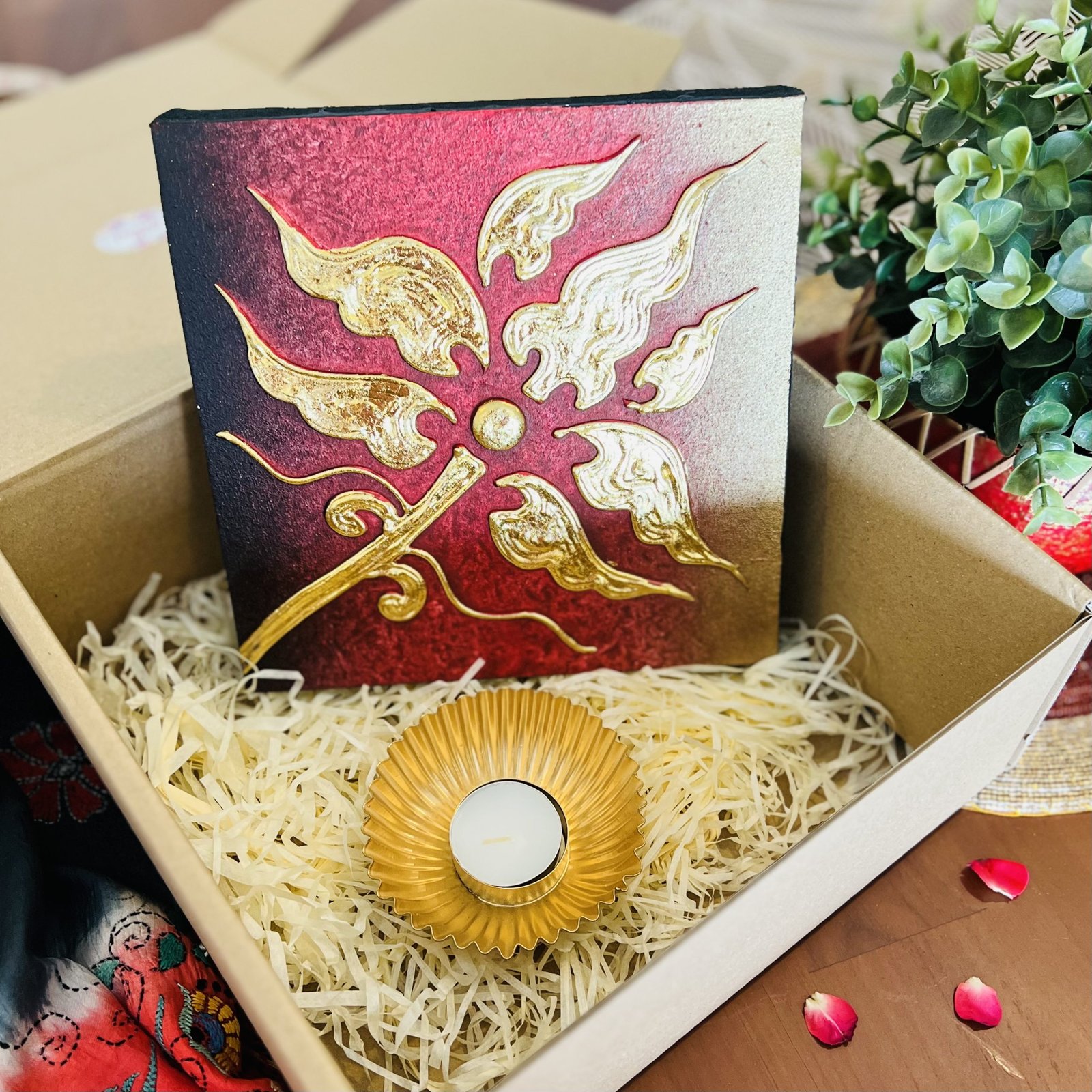 - One Canvas Painting: Dimension – 20x20cm; Material: Acrylic, Gold leaf, Canvas, Solid Wood Frame.