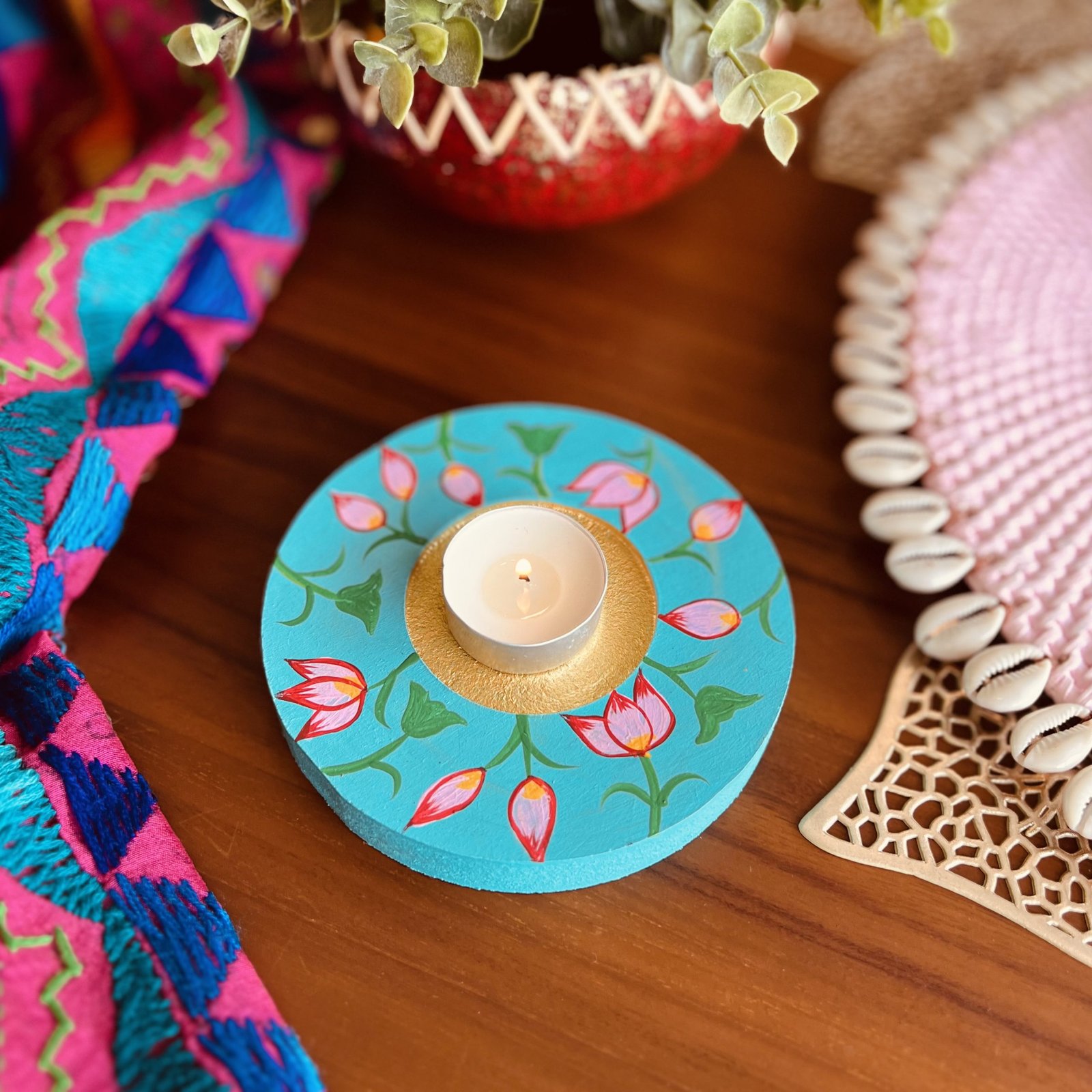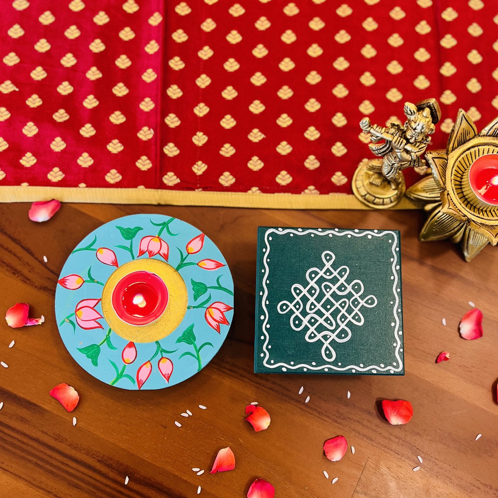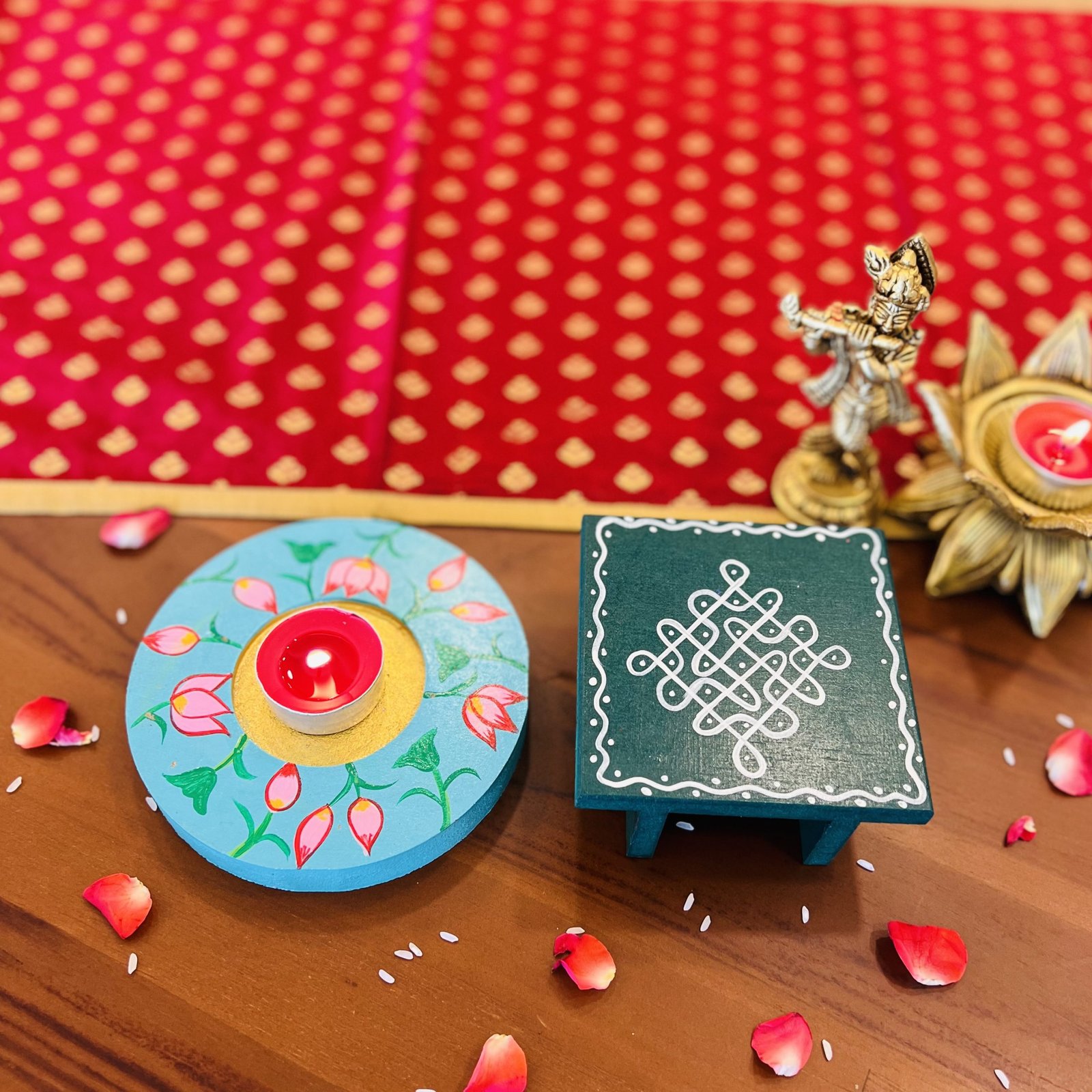 Chowki/Manai & Tea light holder Gift Set (Pichwai Light Blue & Green)