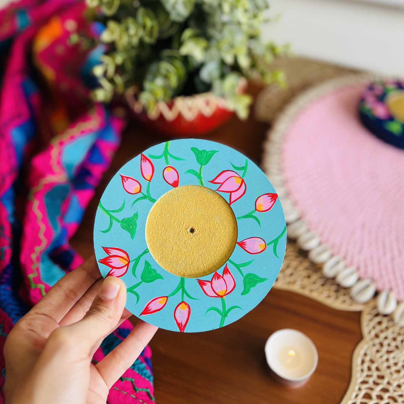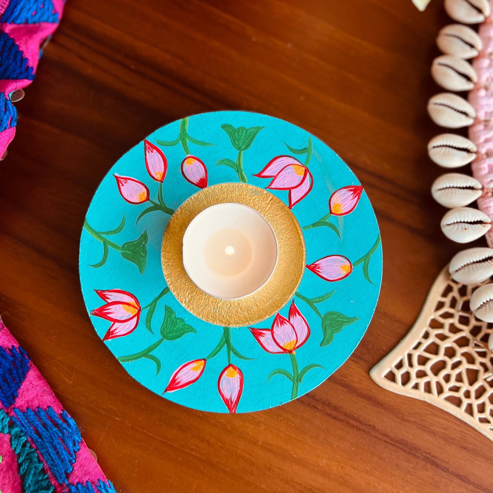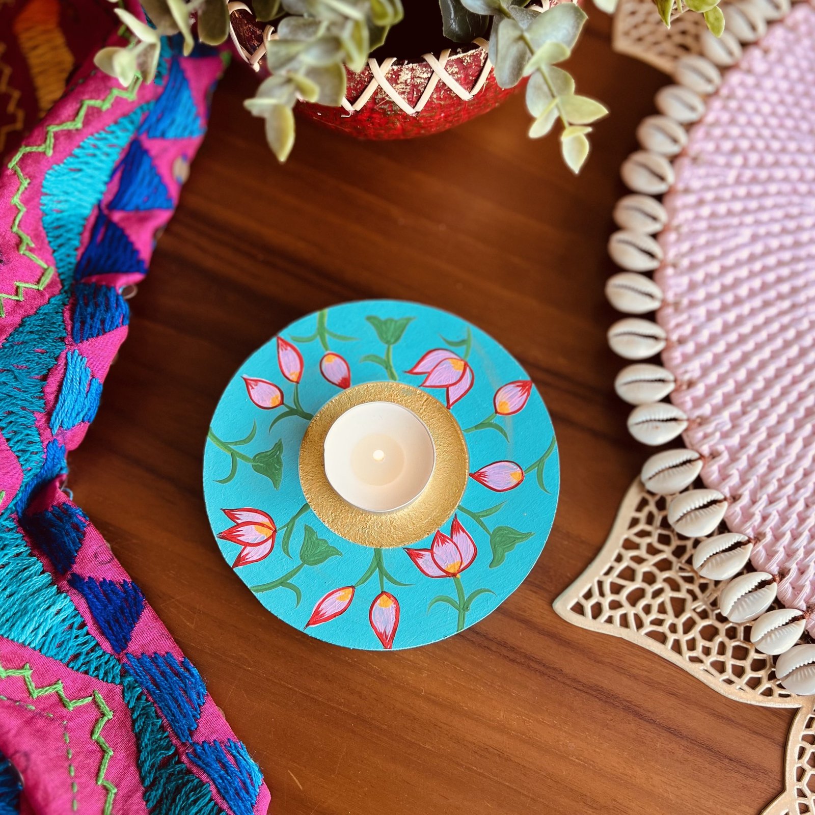 Chowki/Manai & Tea light holder Gift Set (Pichwai Light Blue & Green)