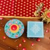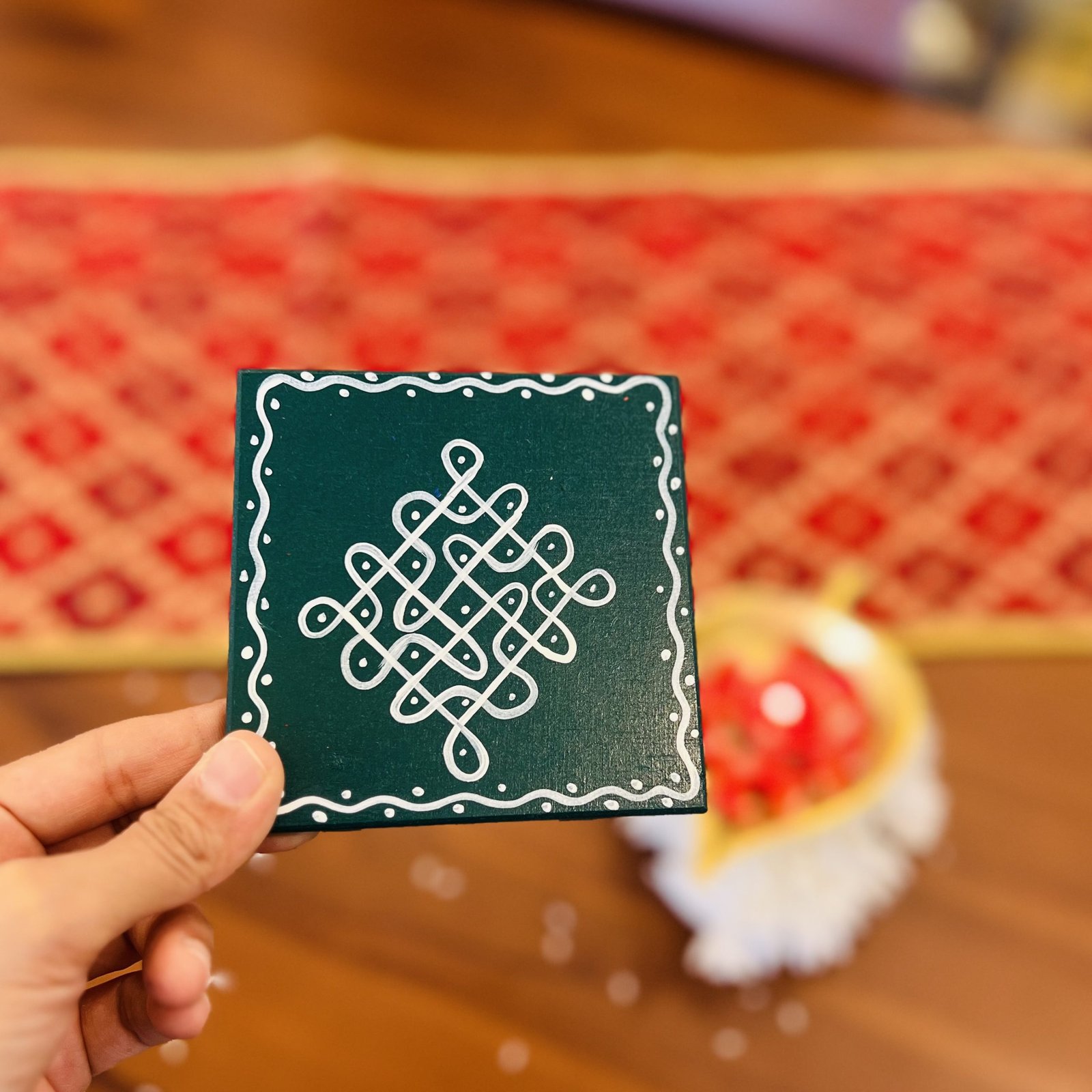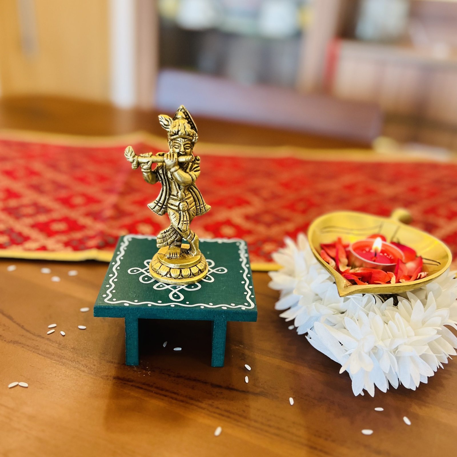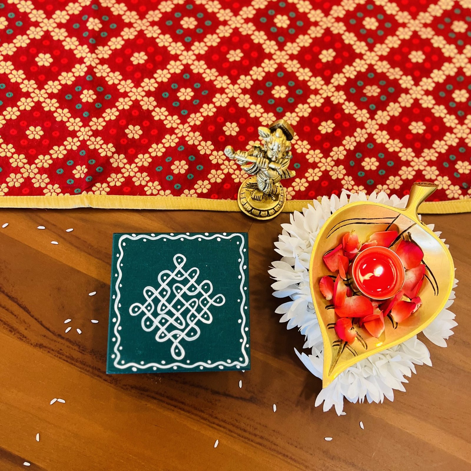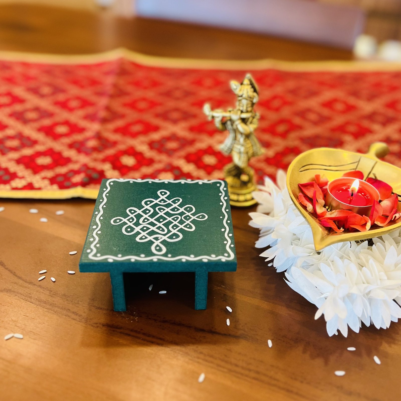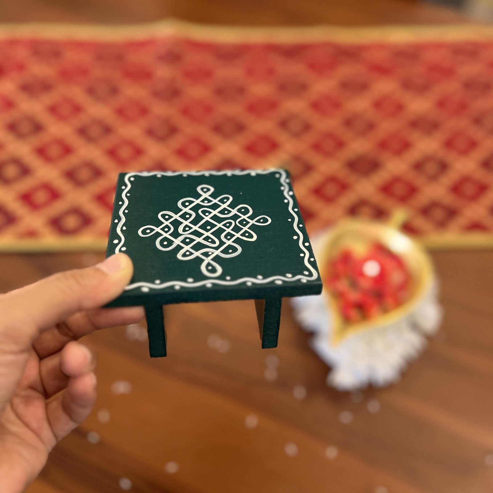 - 1 hand painted wooden chowki/manai – 9.5×9.5 cm (3.5 cm height)