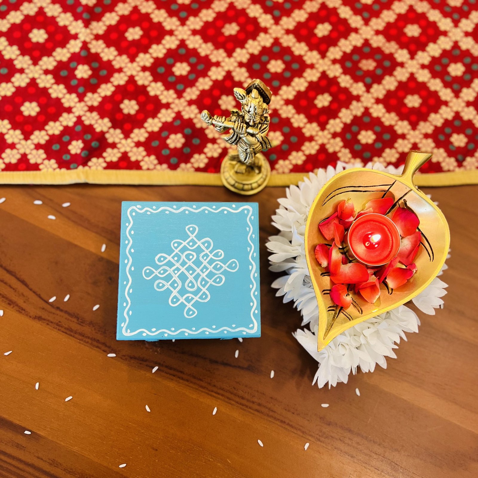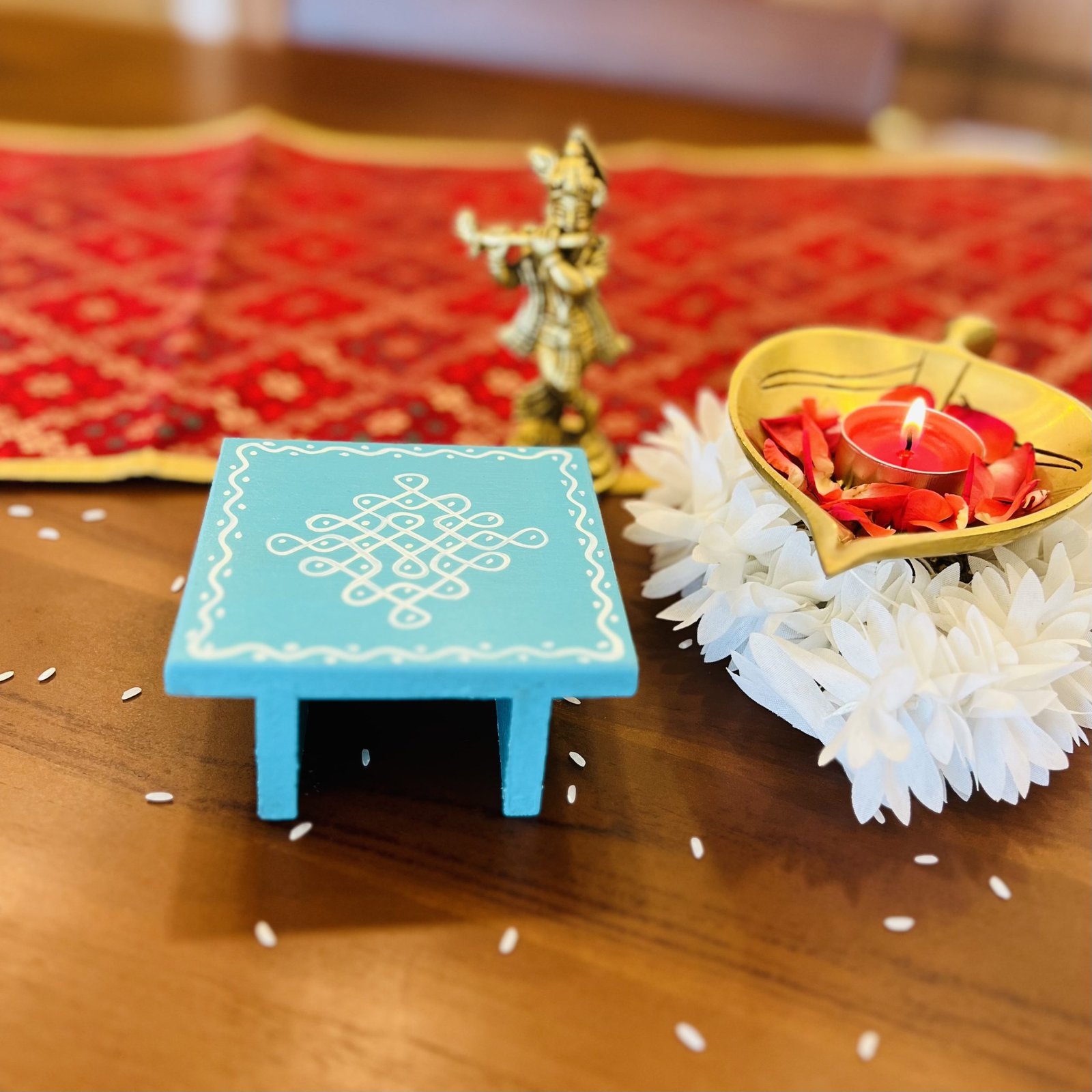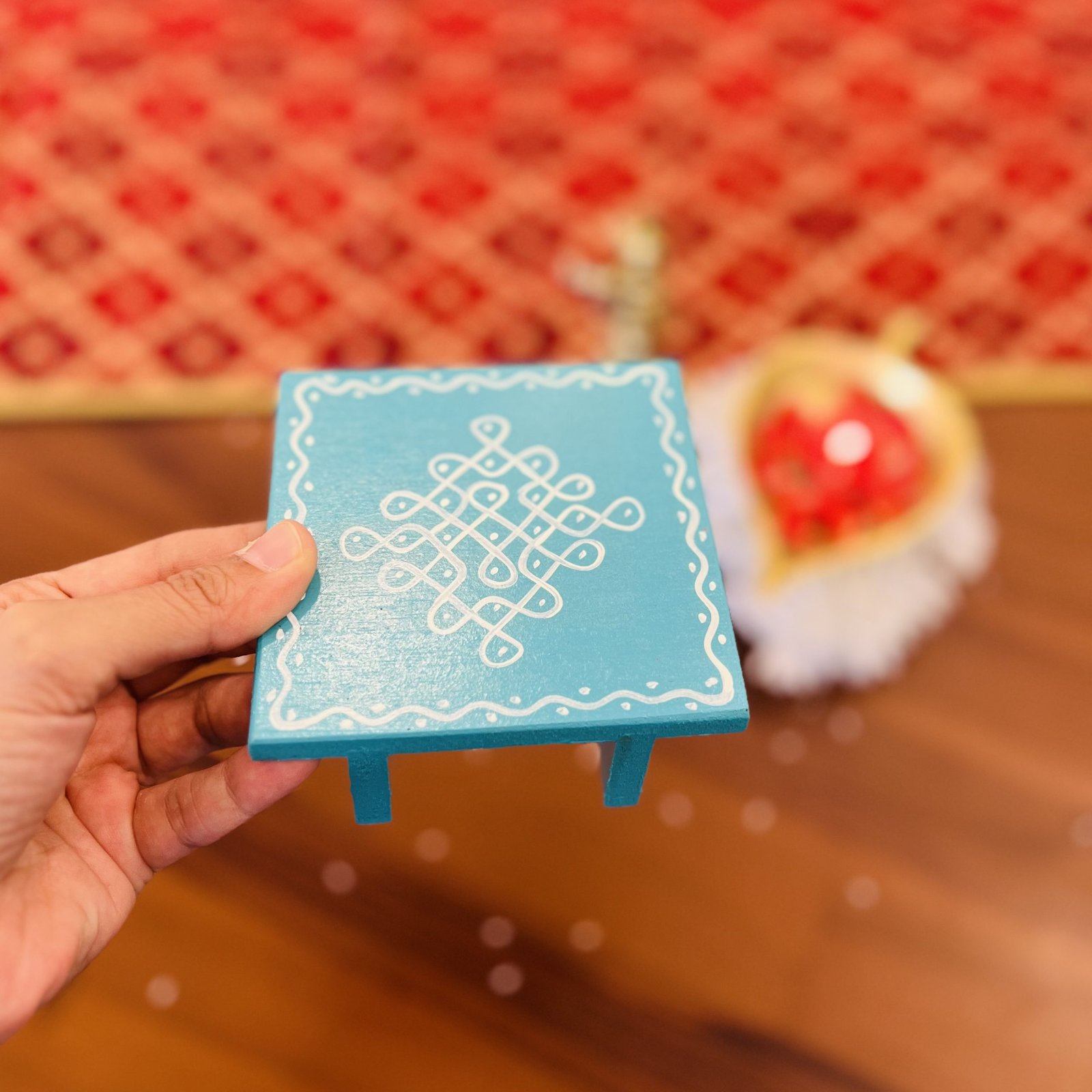 - 1 hand painted wooden chowki/manai – 9.5×9.5 cm (3.5 cm height)