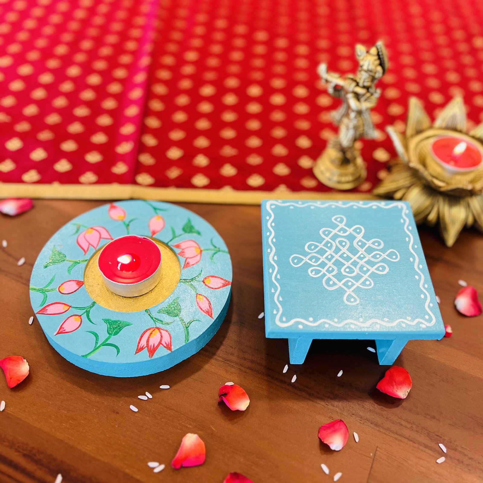 Chowki/Manai & Tea light holder Gift Set (Pichwai Light Blue)