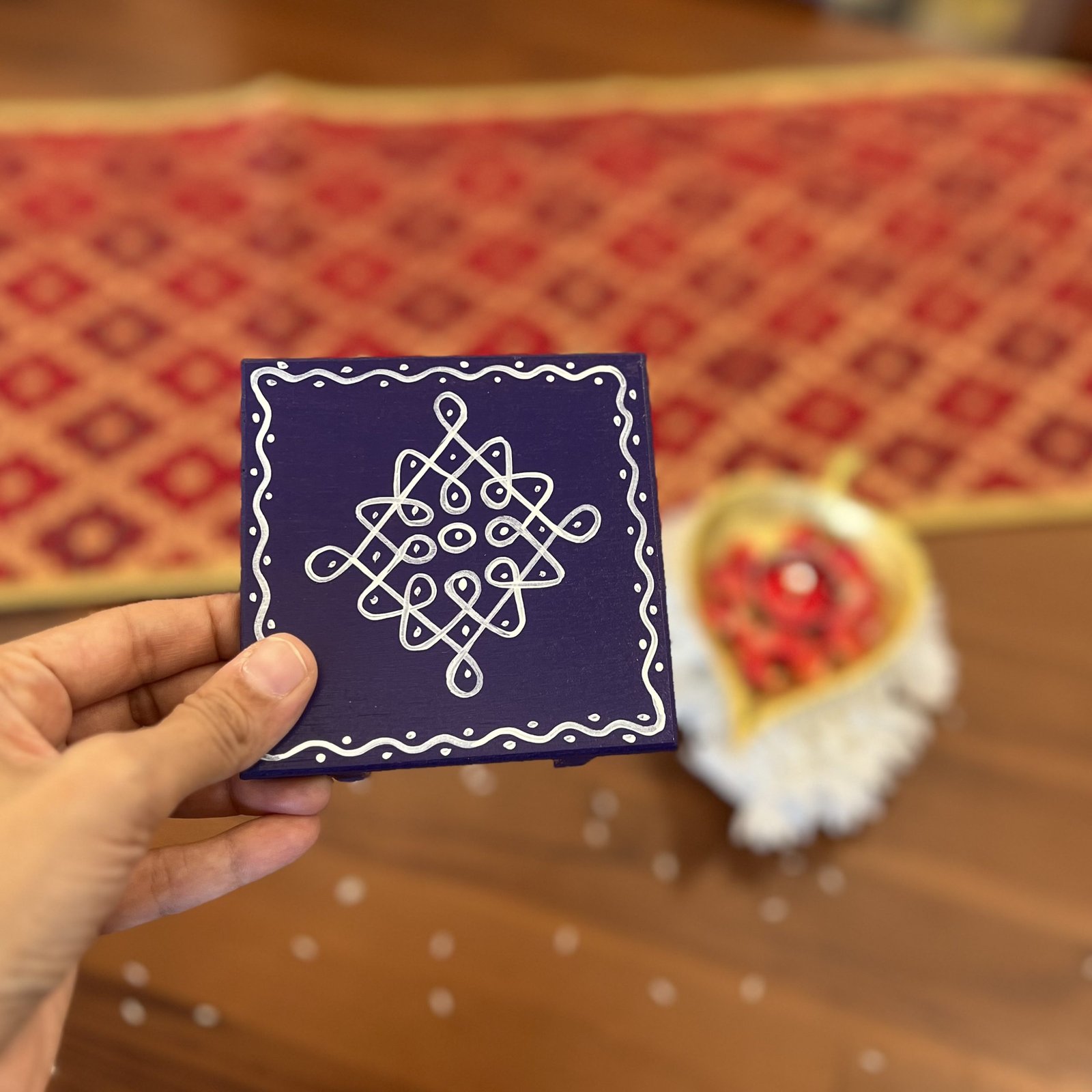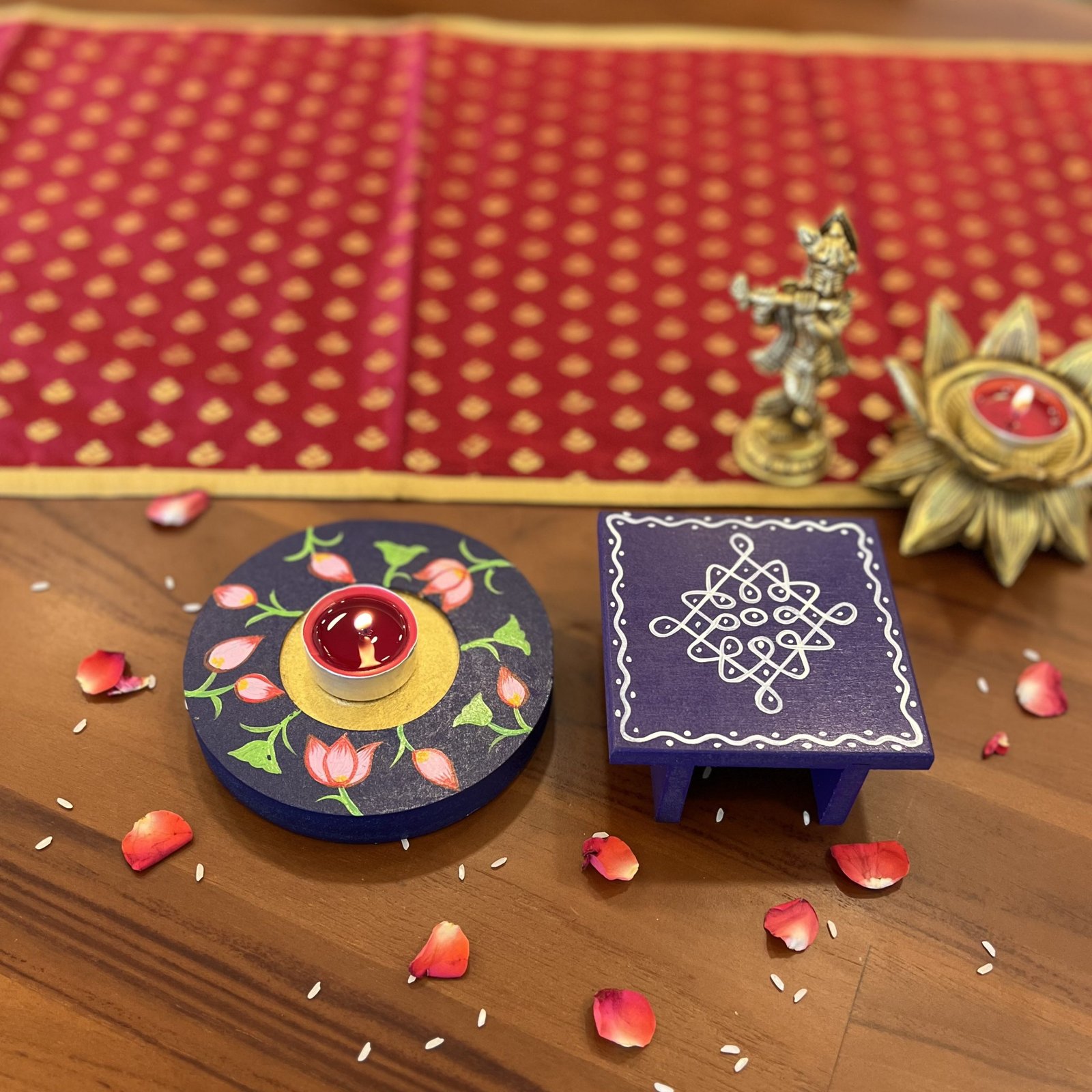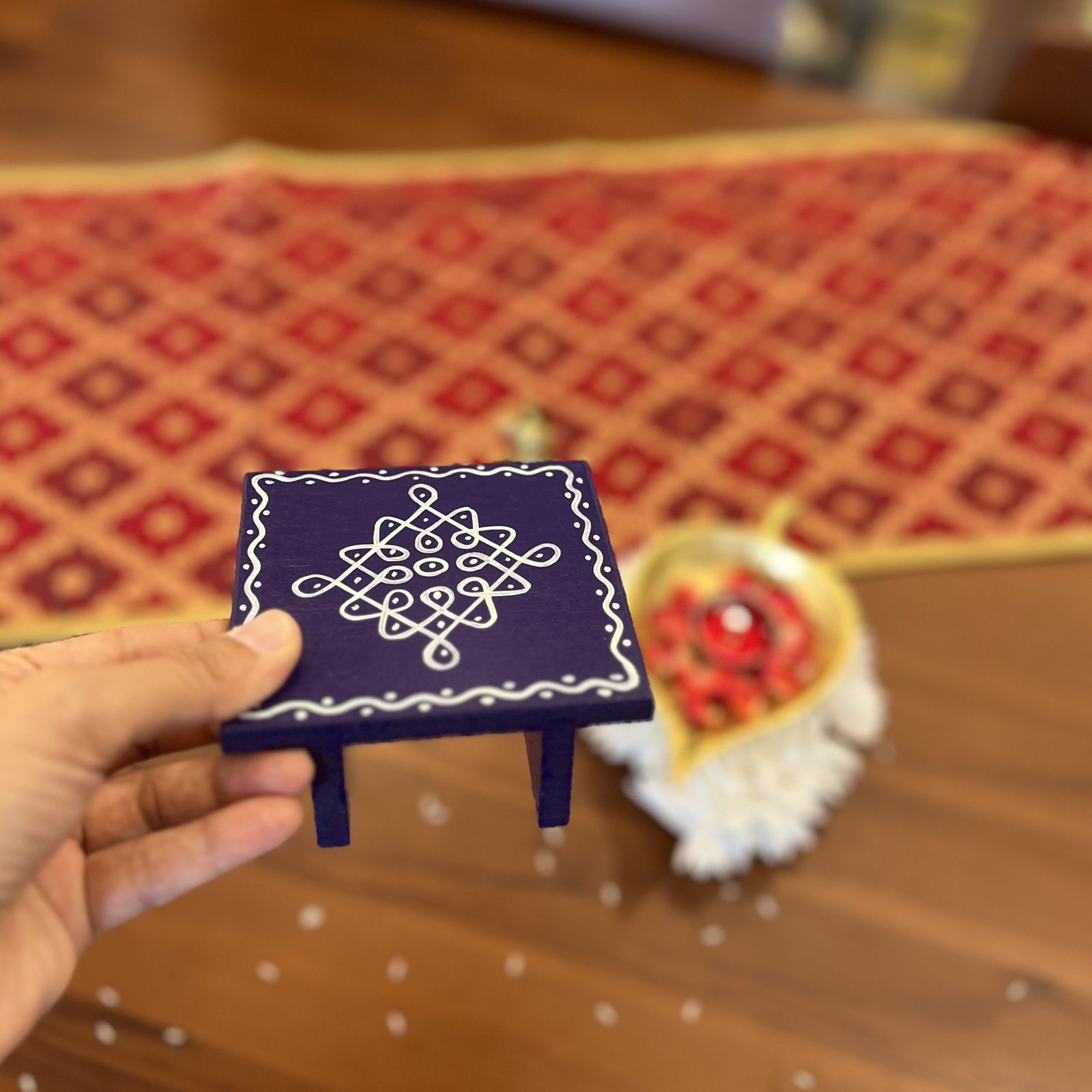 - 1 hand painted wooden chowki/manai – 9.5×9.5 cm (3.5 cm height)