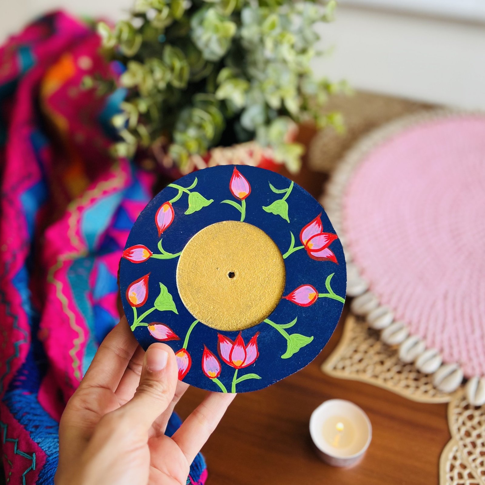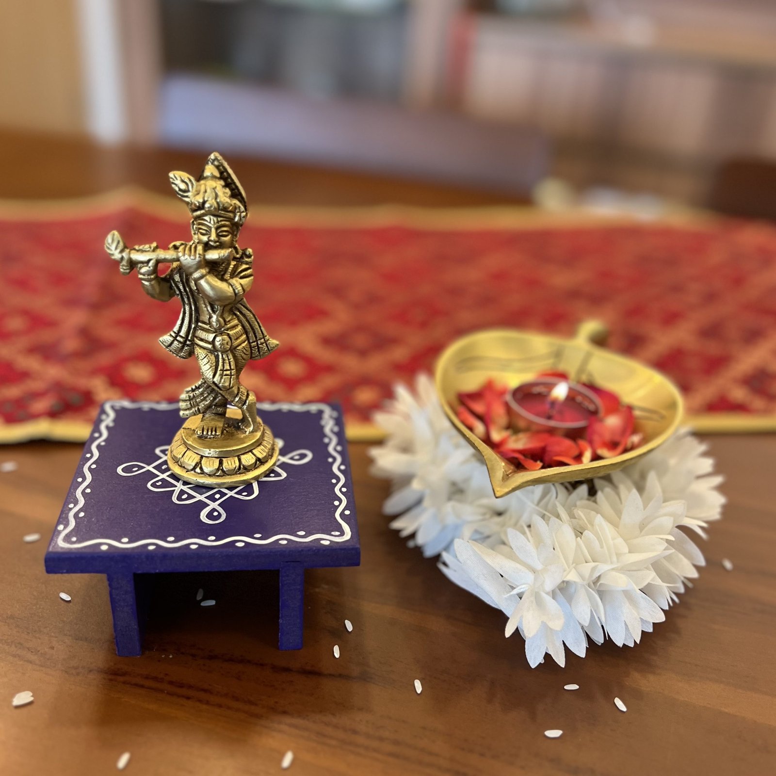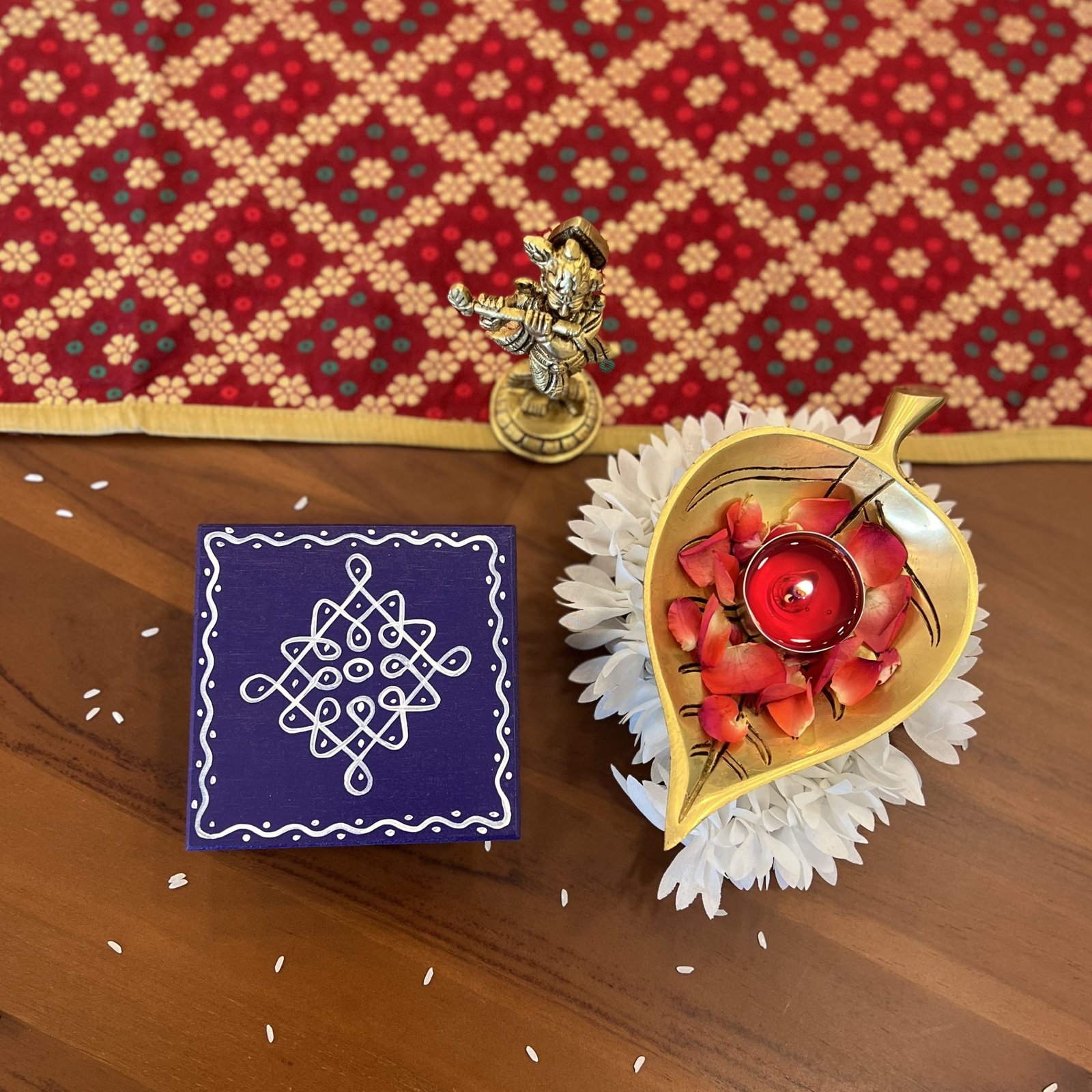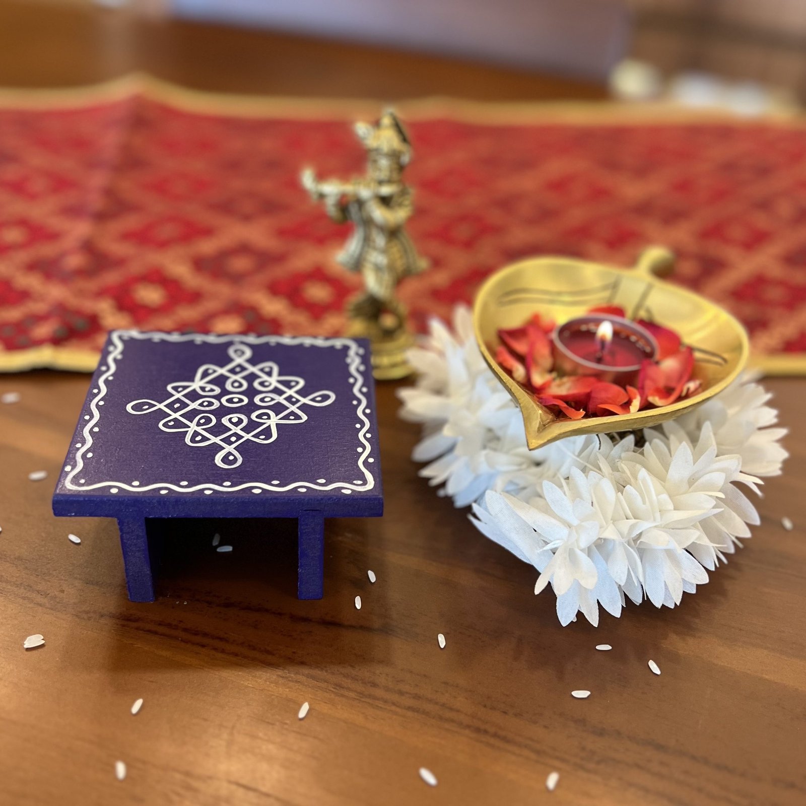 - 1 hand painted wooden chowki/manai – 9.5×9.5 cm (3.5 cm height)