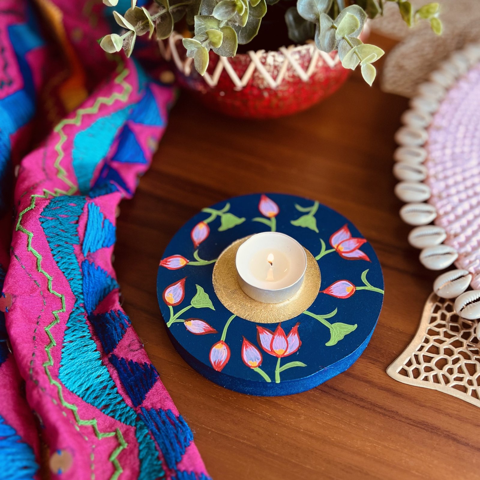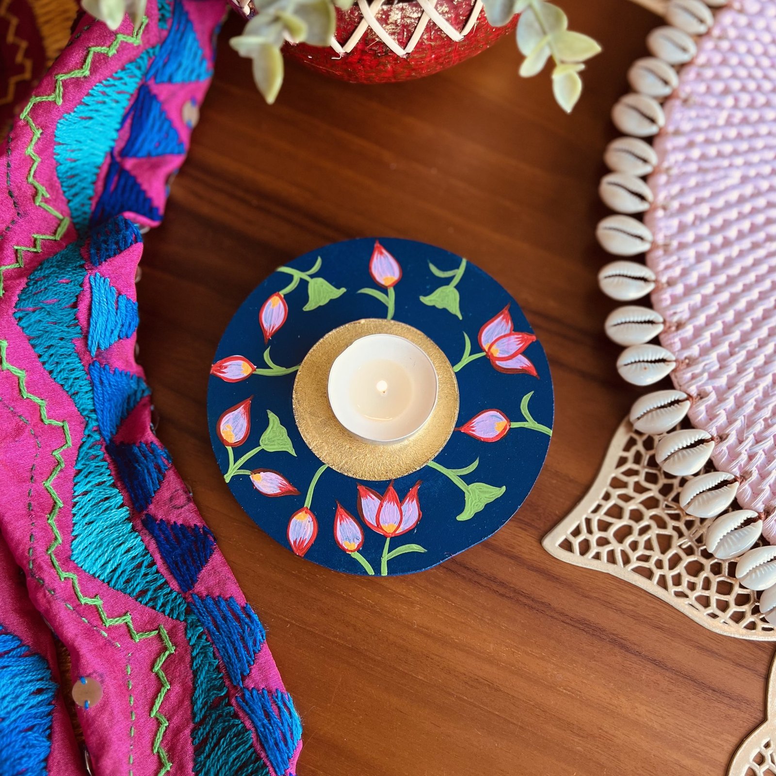 - 1 hand painted wooden tea light holder with one wax tea light – 12 cm diameter