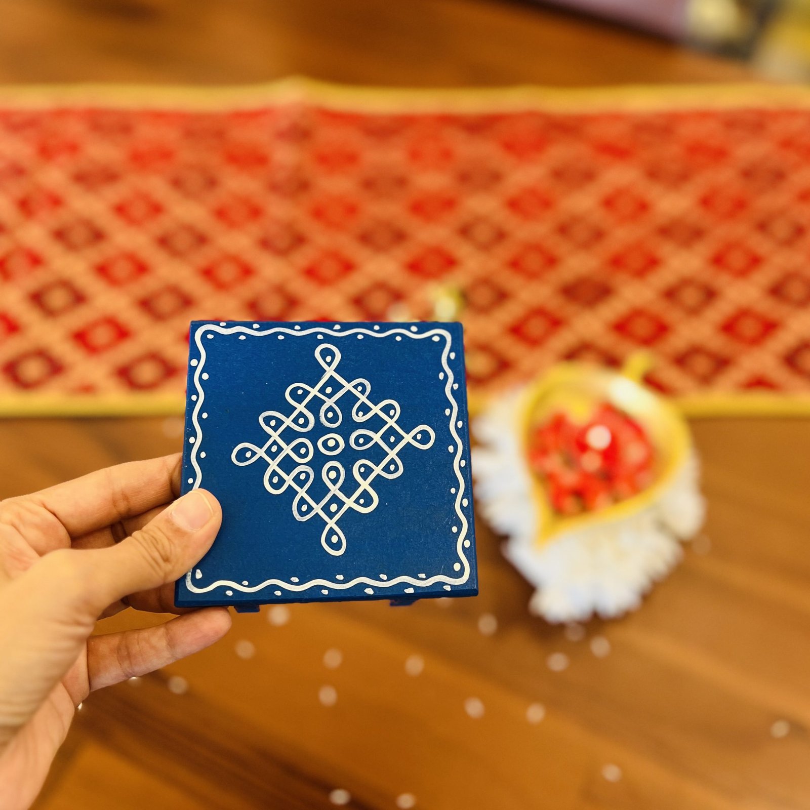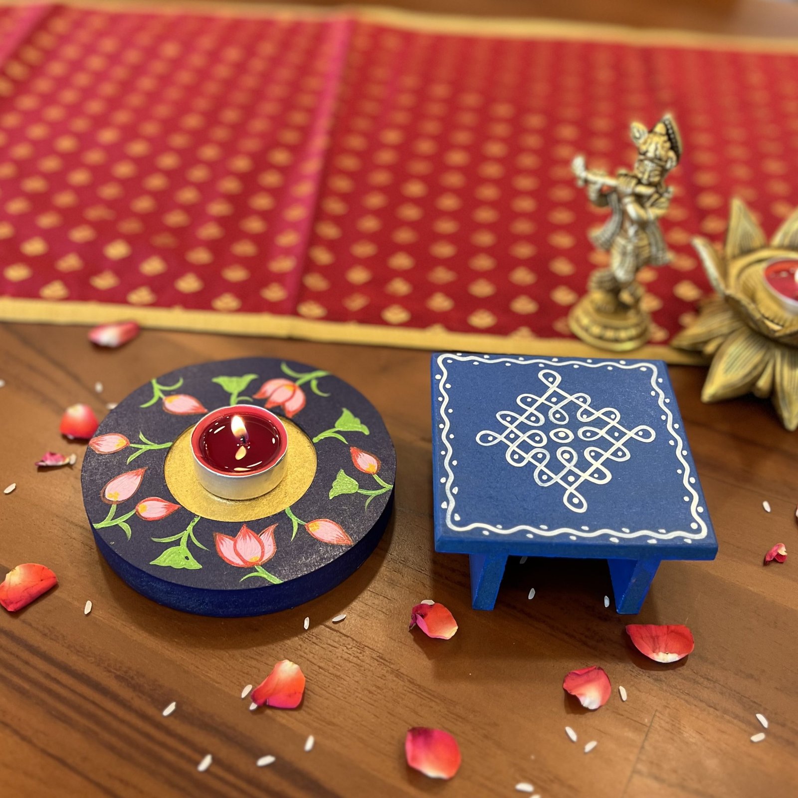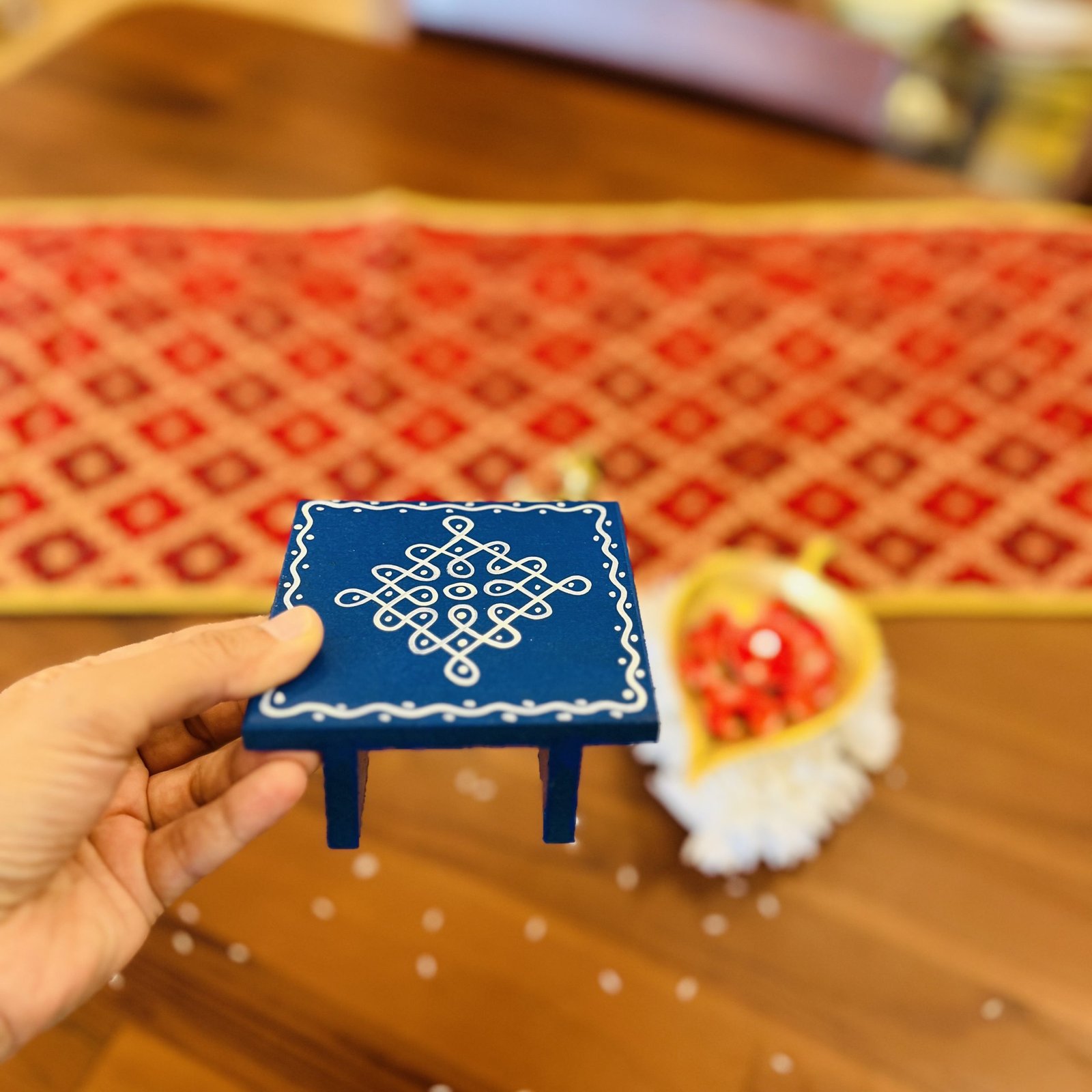- 1 hand painted wooden chowki/manai – 9.5×9.5 cm (3.5 cm height)