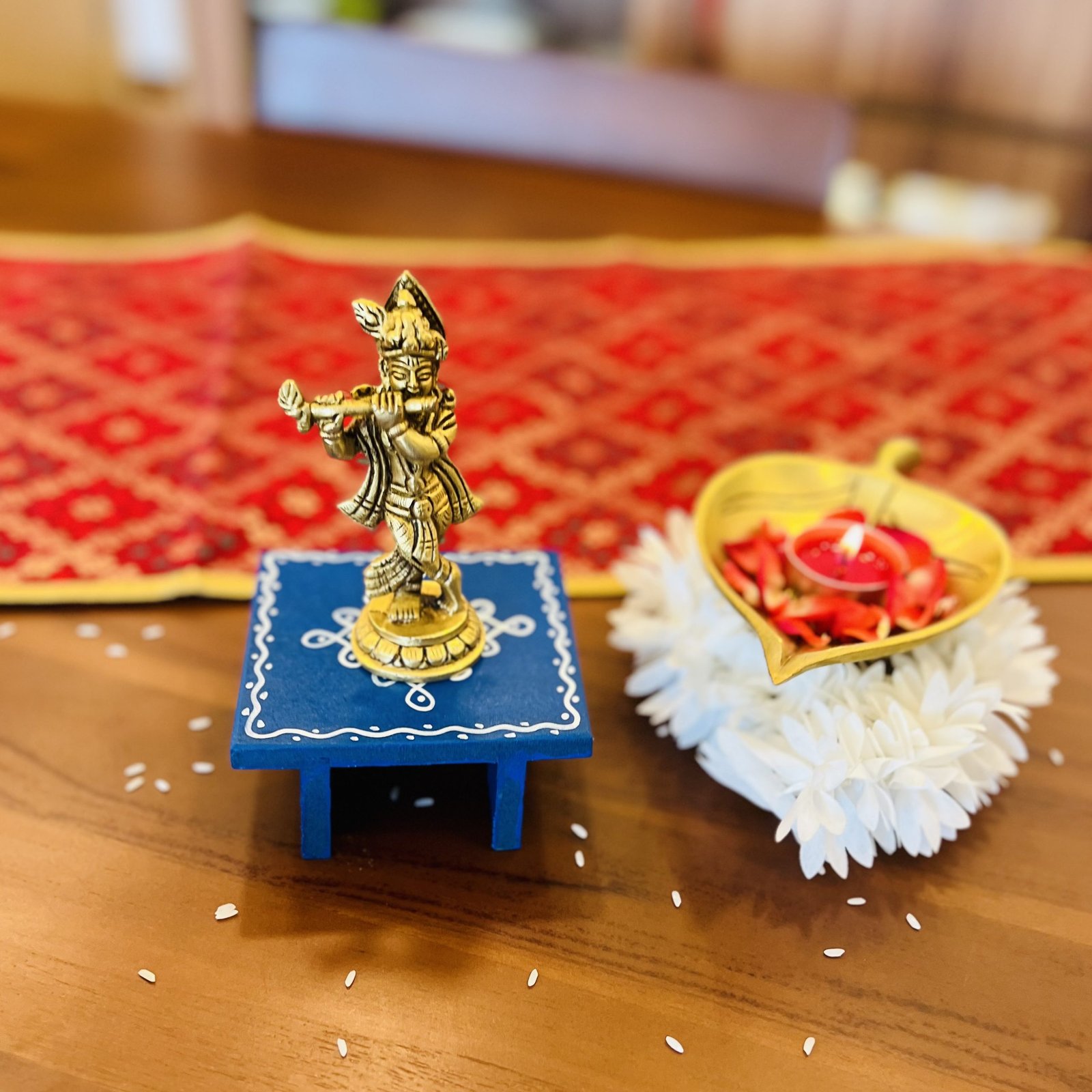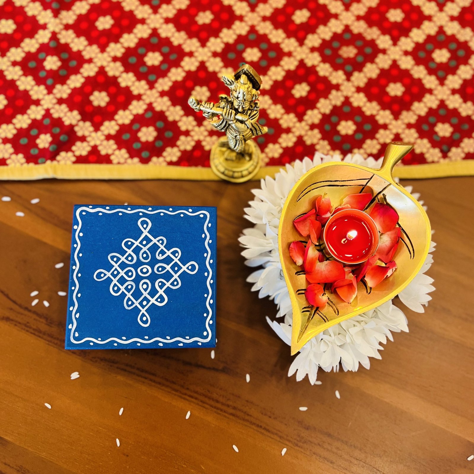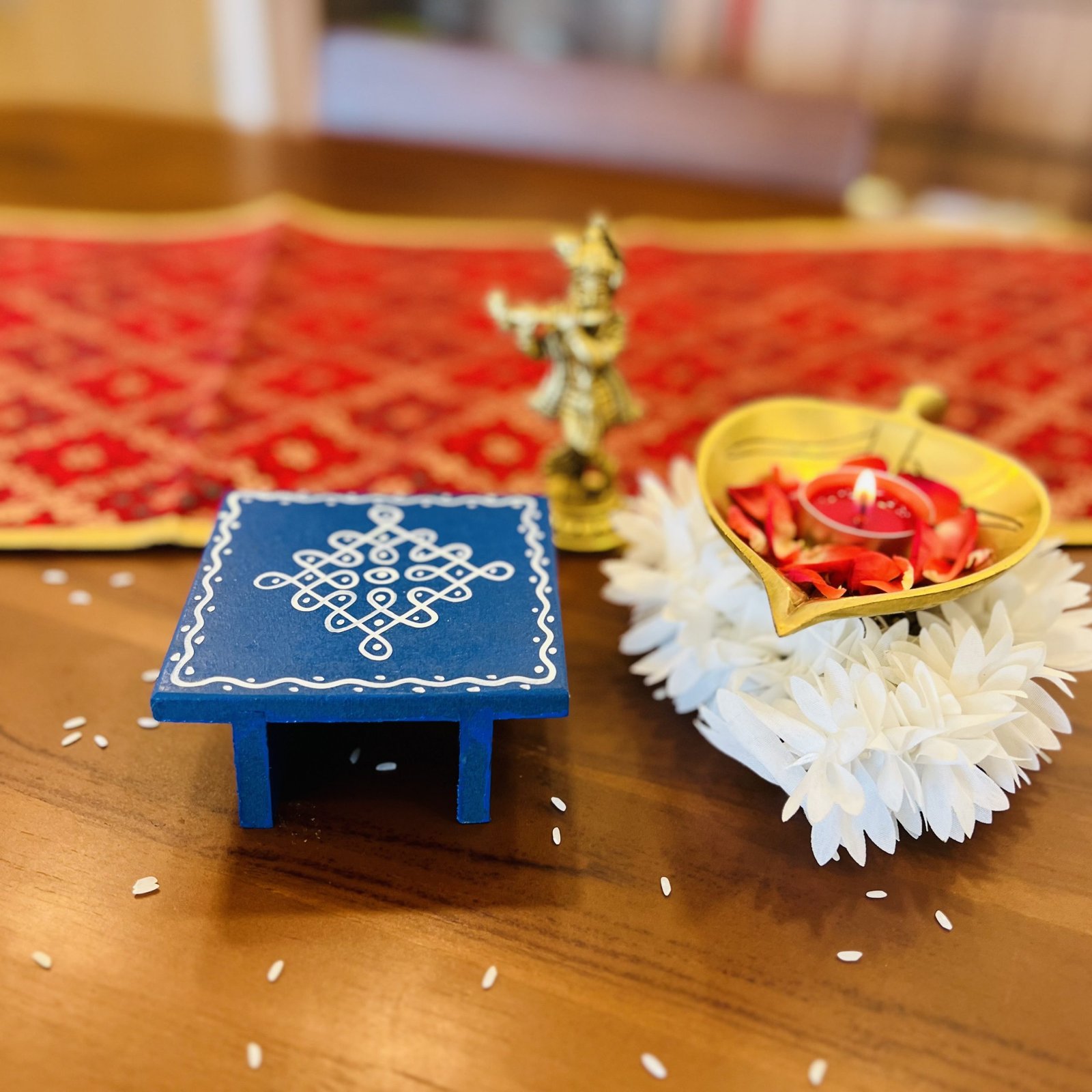 - 1 hand painted wooden chowki/manai – 9.5×9.5 cm (3.5 cm height)