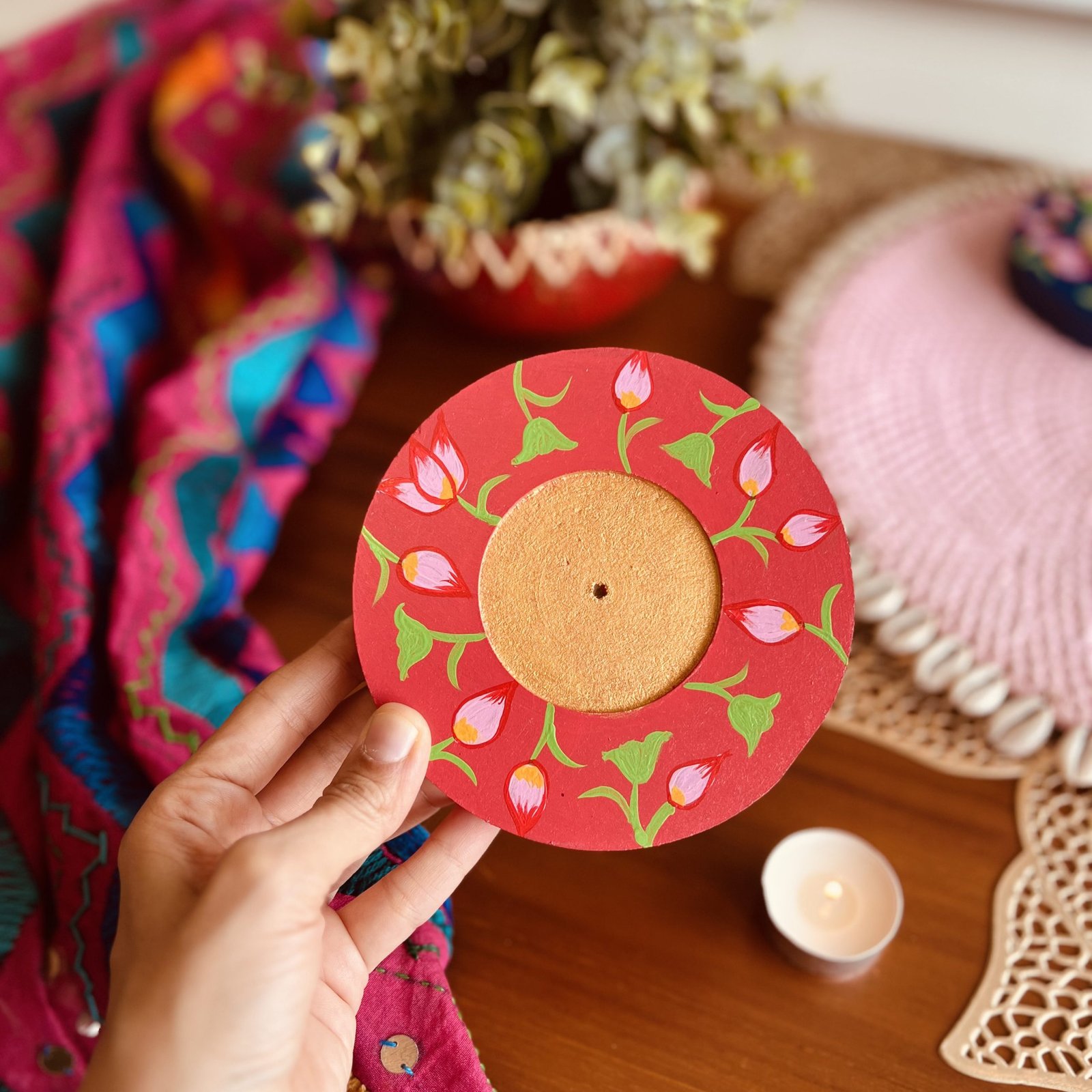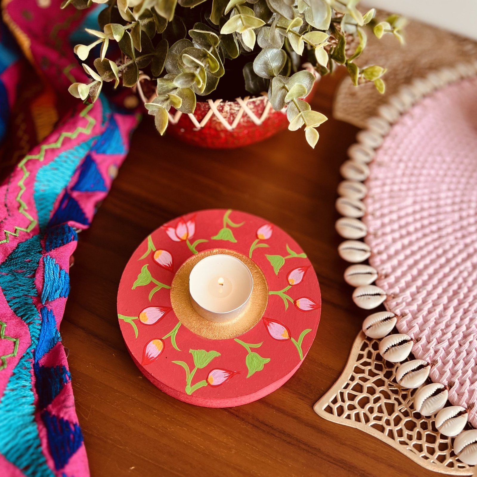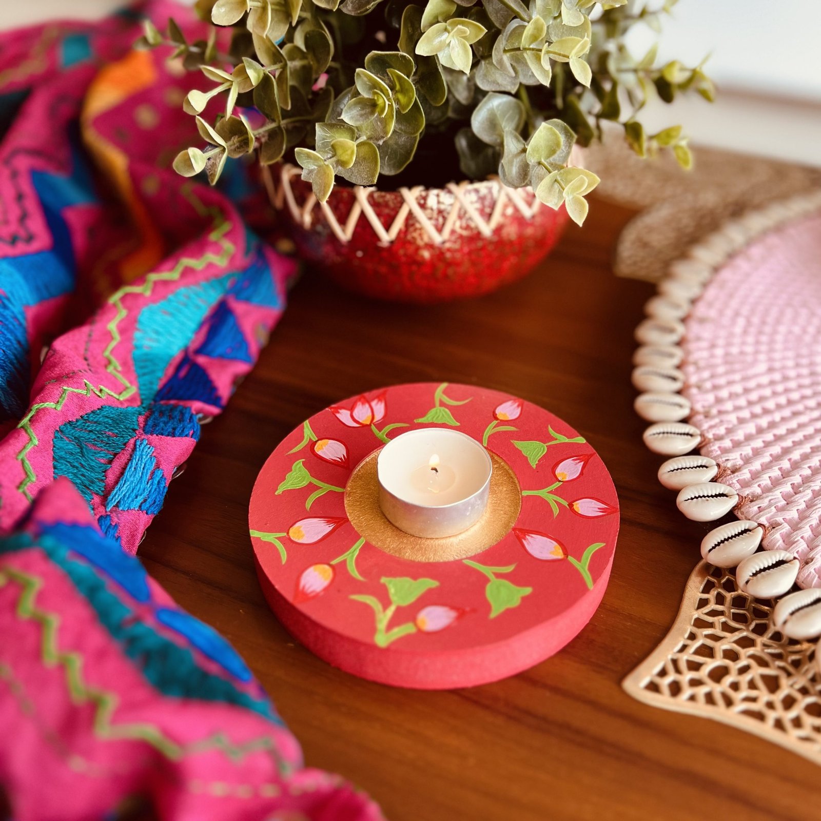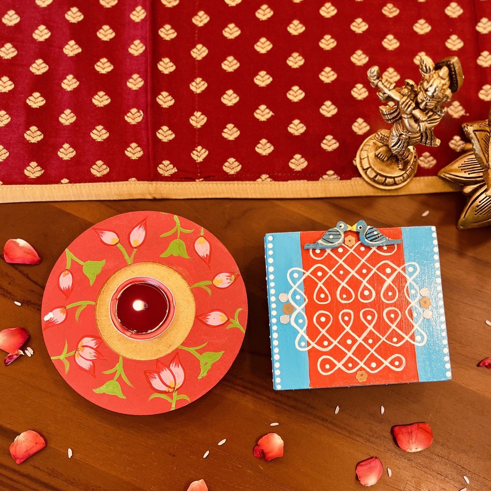Chowki/Manai & Tea light holder Gift Set (Pichwai Red)