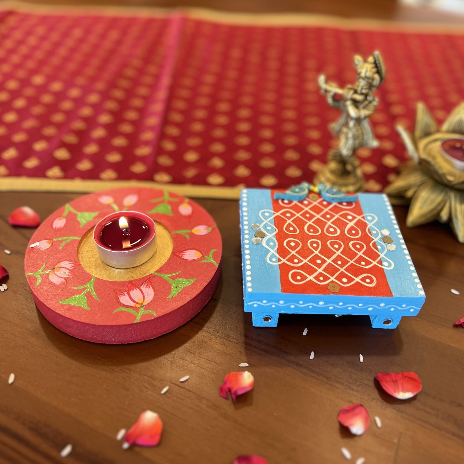 - 1 hand painted wooden chowki/manai – 9.5×9.5 cm (3.5 cm height)