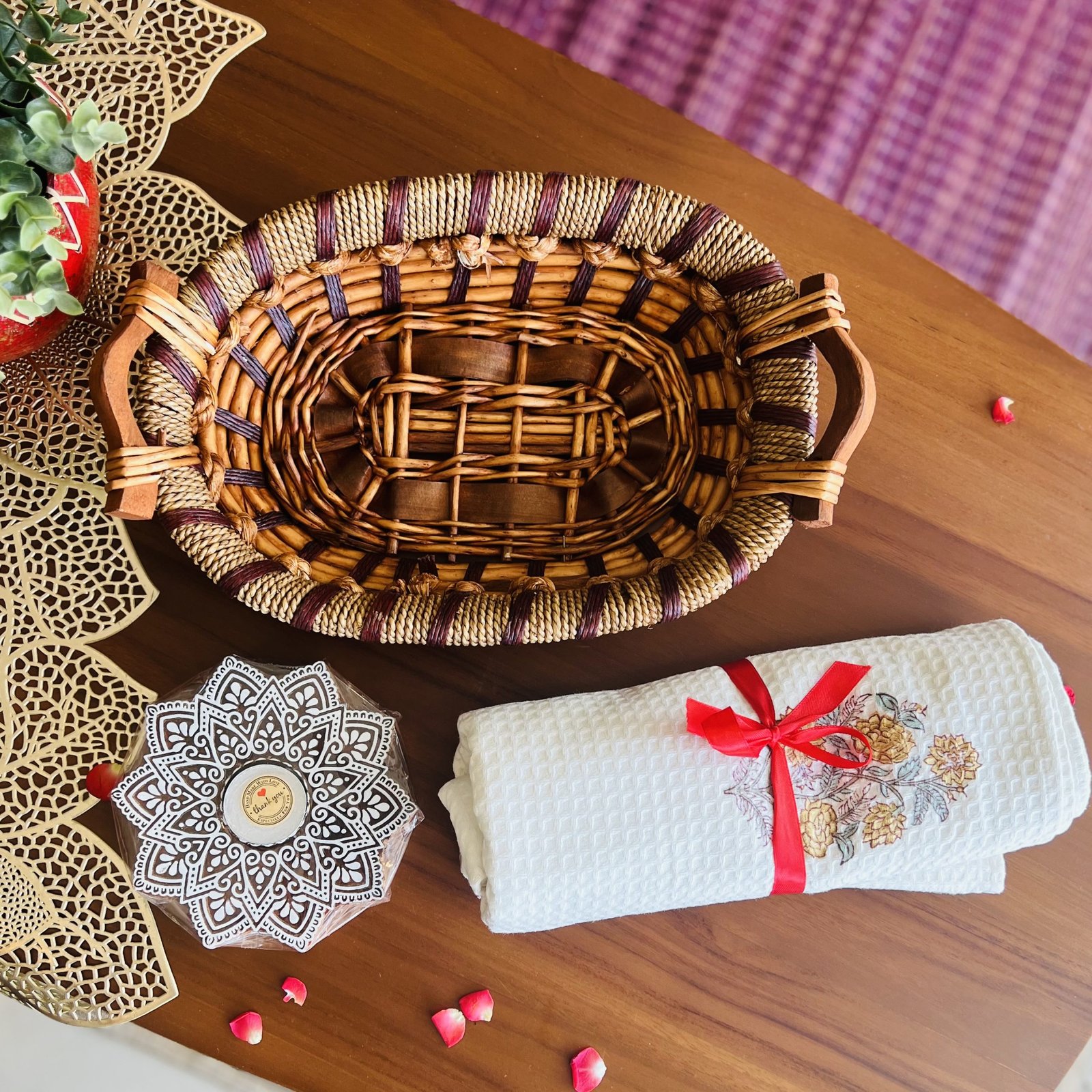 Includes: 1 Bath towel assorted design and 1 block diya with candle in a gift hamper basket. please message us for any customisations.