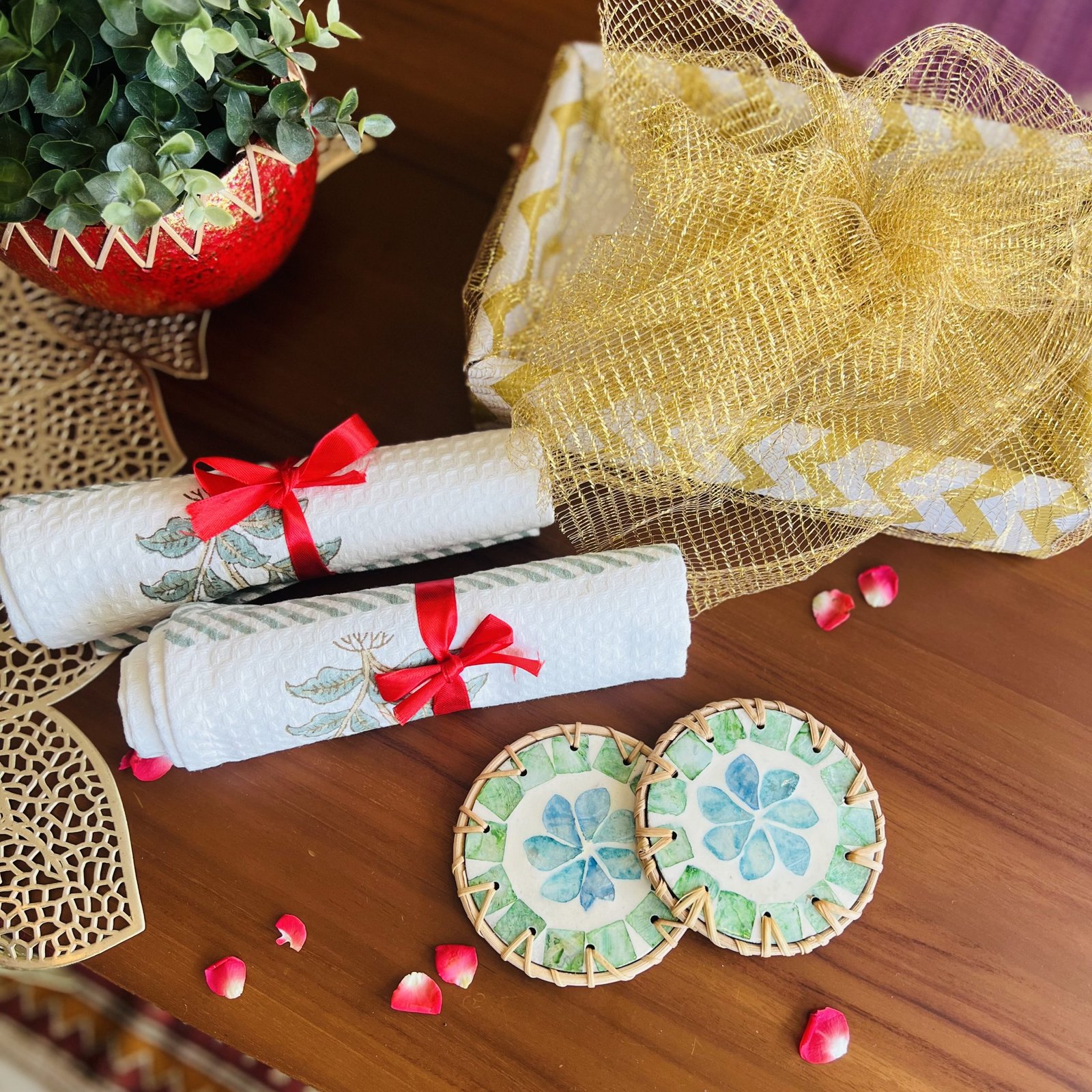 Includes: 2 assorted hand towels and 2 coasters assorted colors and designs in a hamper gift box. please message us for any customisations.