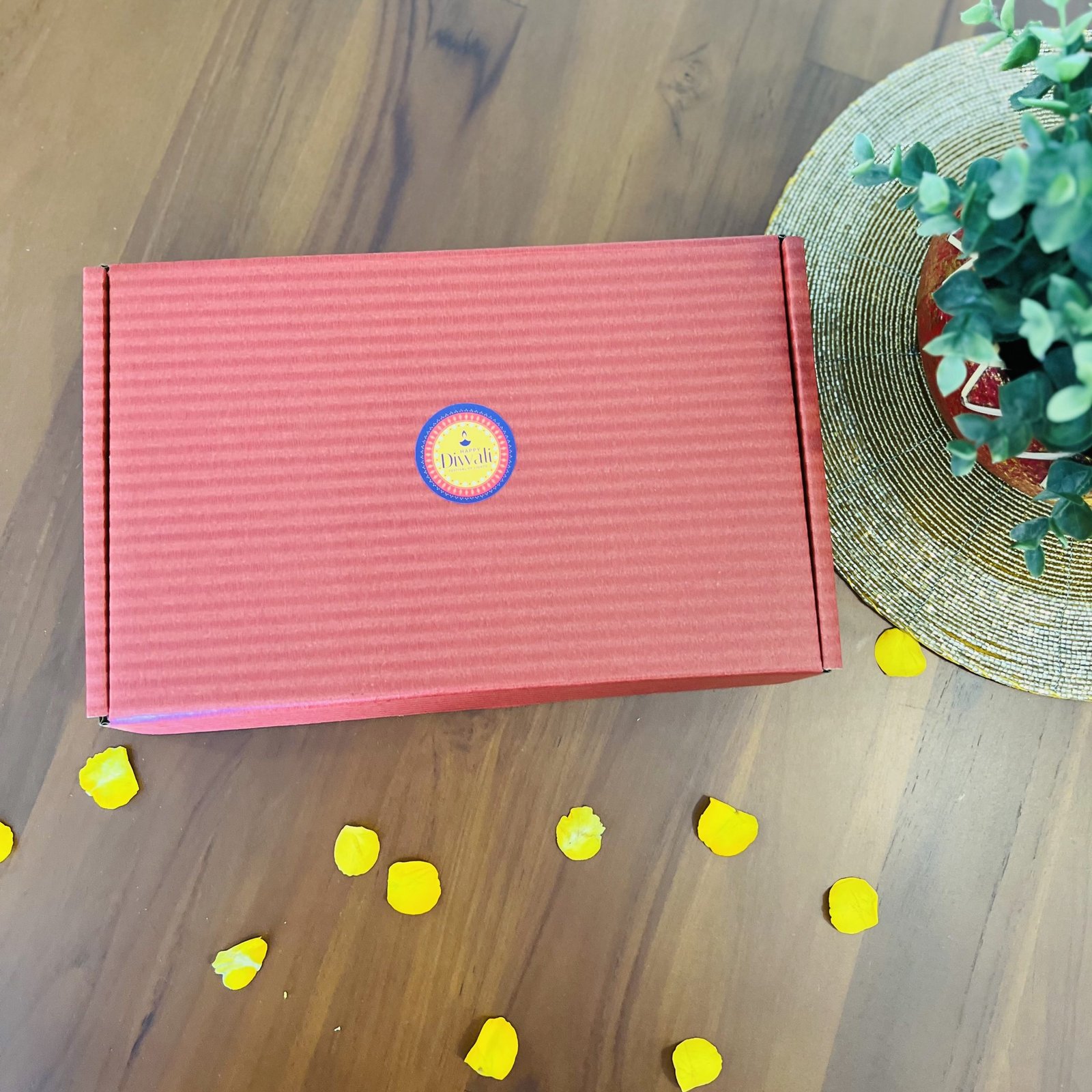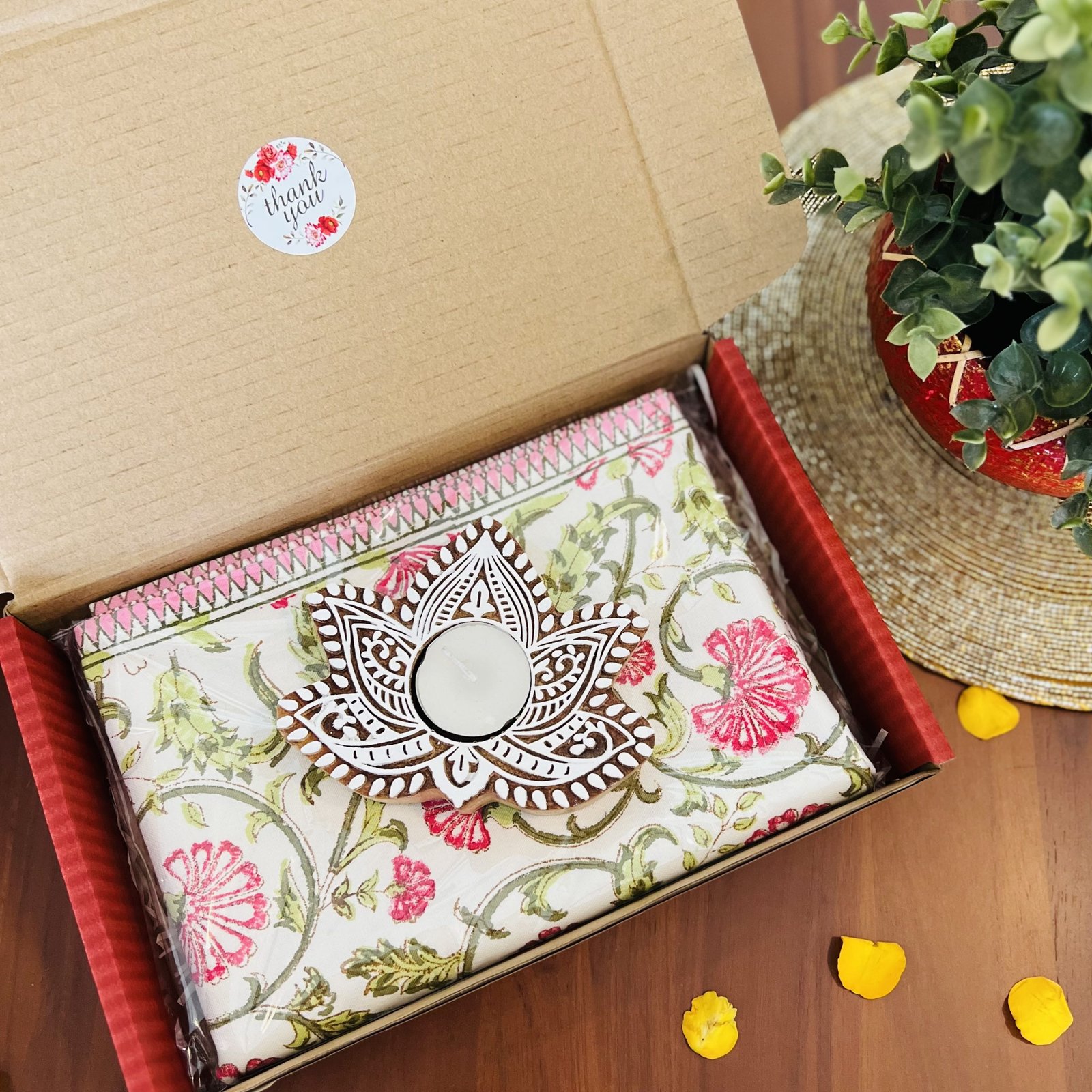Includes: 1 cotton table runner and 1 wooden block diya with candle in a gift box. Other combinations of table runner is possible, please message us.