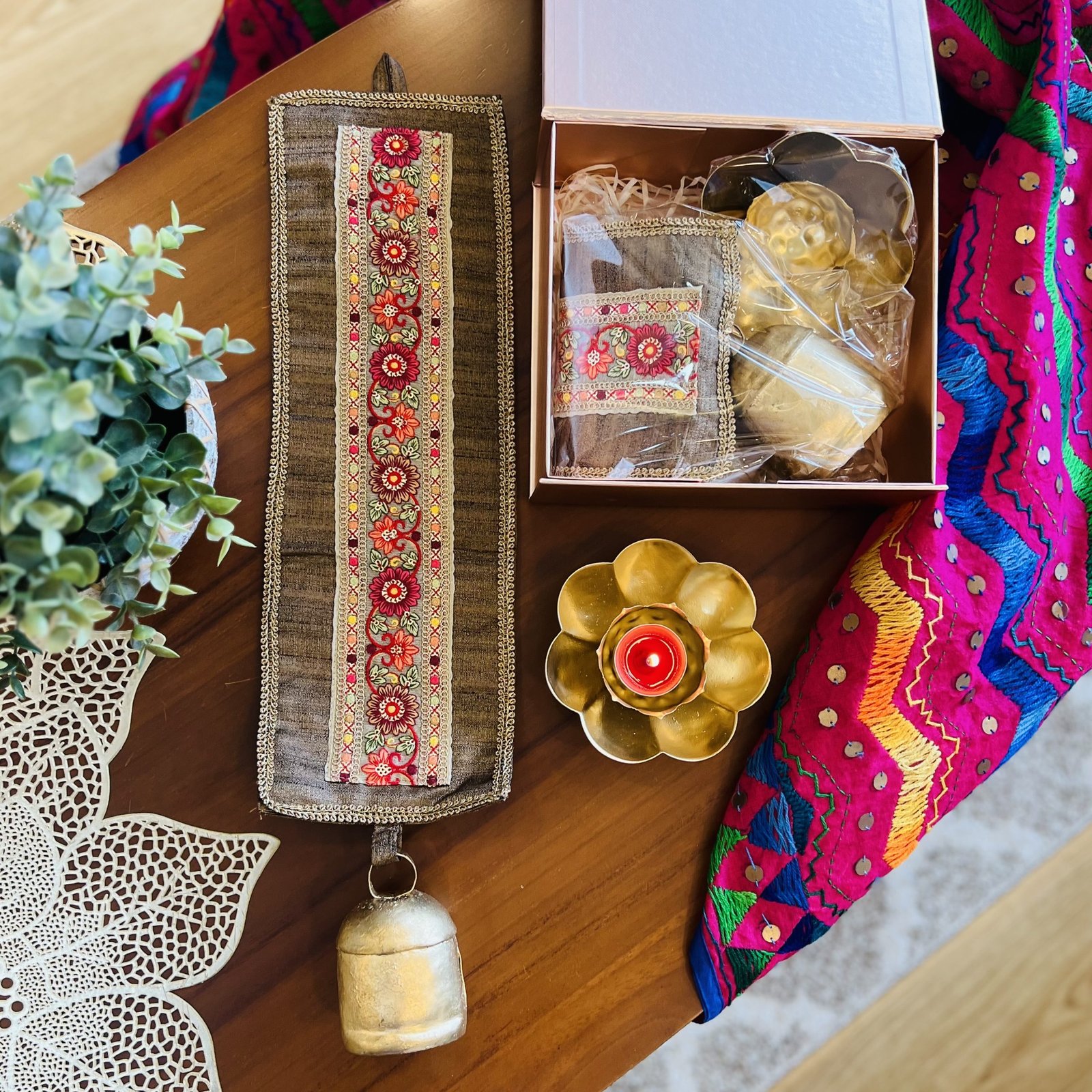 1 Brocade silk bell – Material: Brocade silk, Bell: Copper mixed with 4 other metals for musical sound Dimensions: 50cm (Total Height) x 12.5cm(Width). 41×12.5 cm (Cloth Dimension)