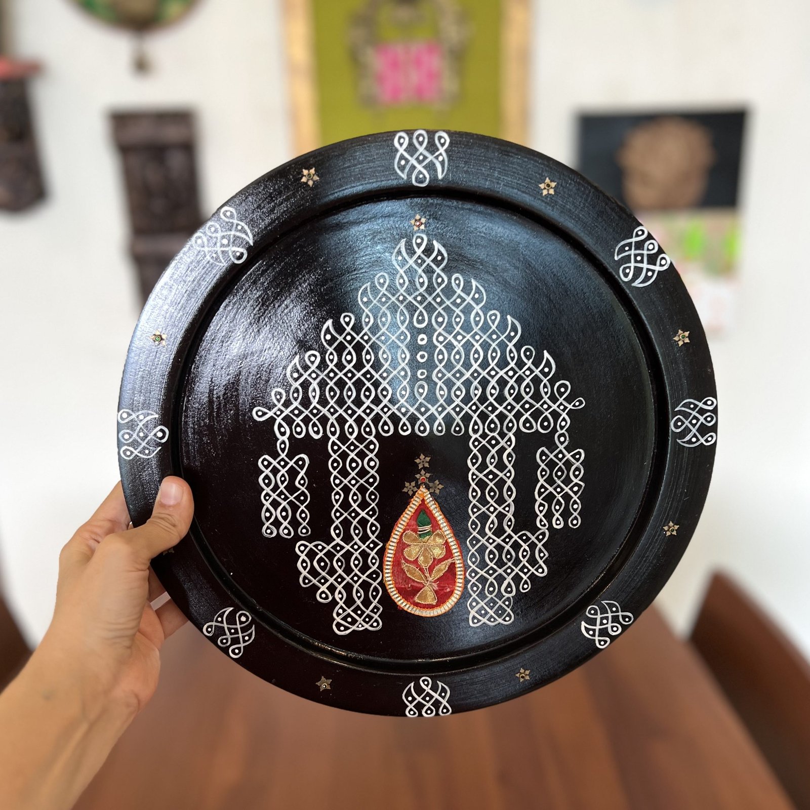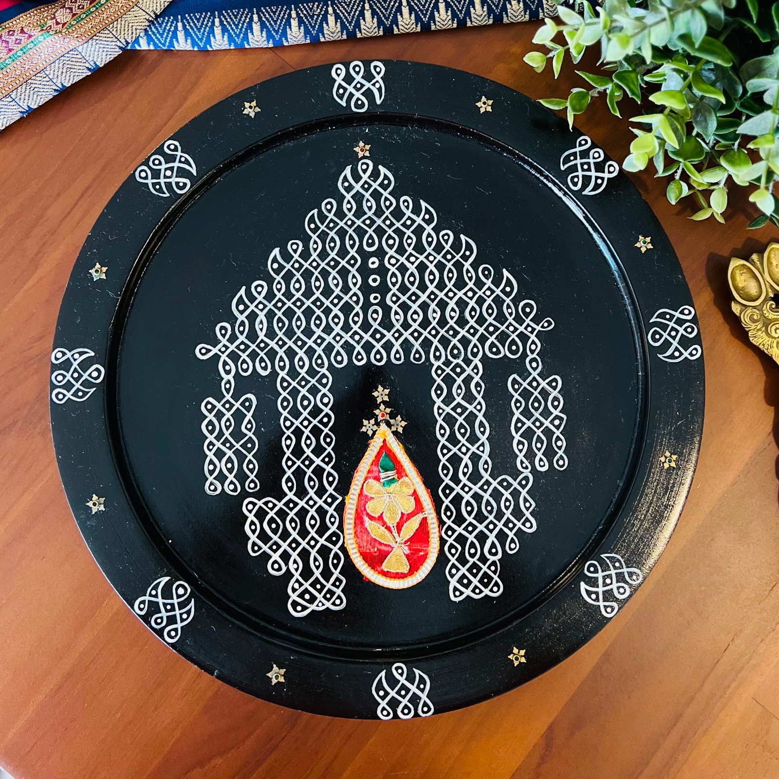 N0te: Includes only the black kolam platter with green gota patch, excludes the mat, brass diyas and other accessories in the photo. Gota patch is fixed to the platter
