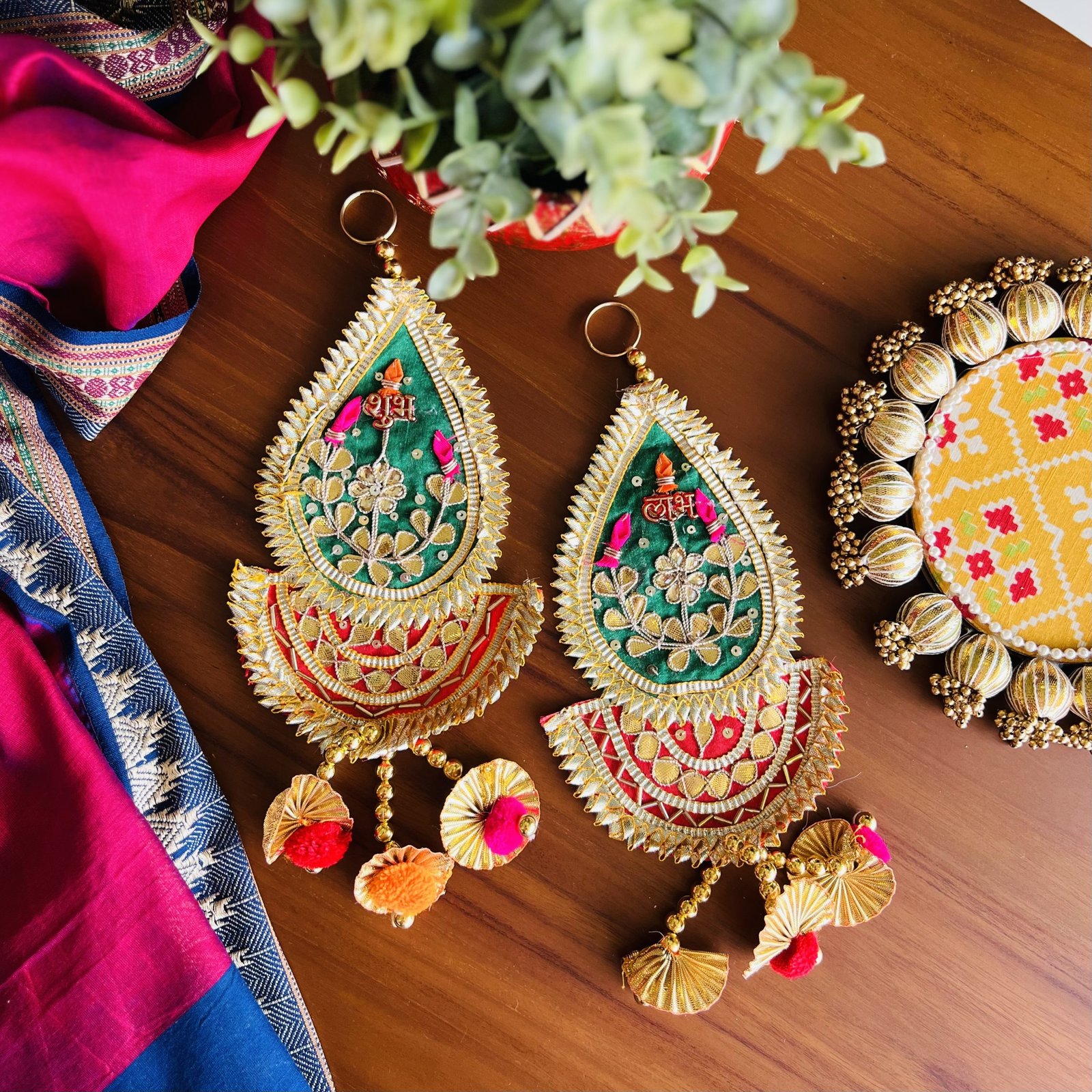 - 1 festive gota patti green color subh labh pair for door or wall hanging – 27x12cm