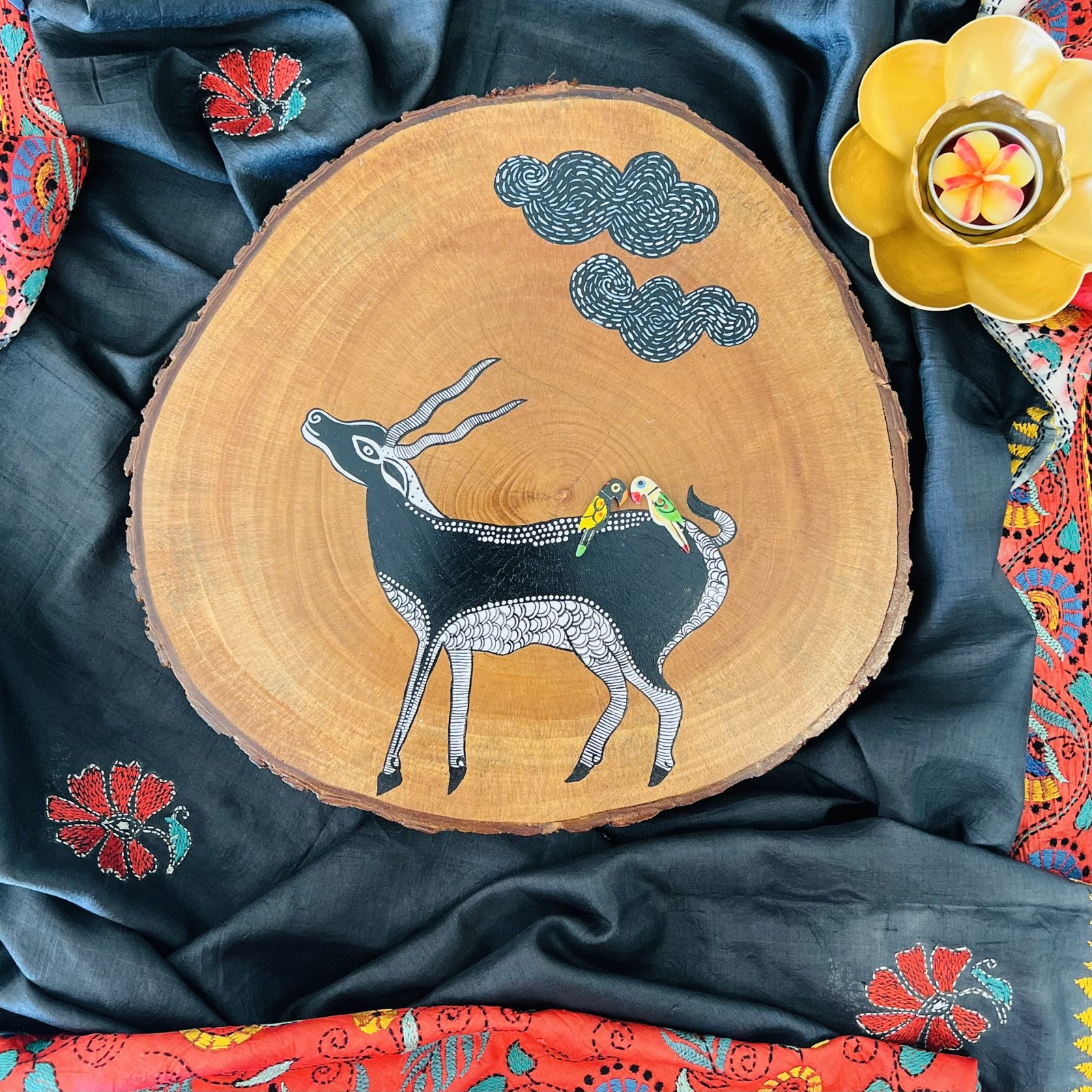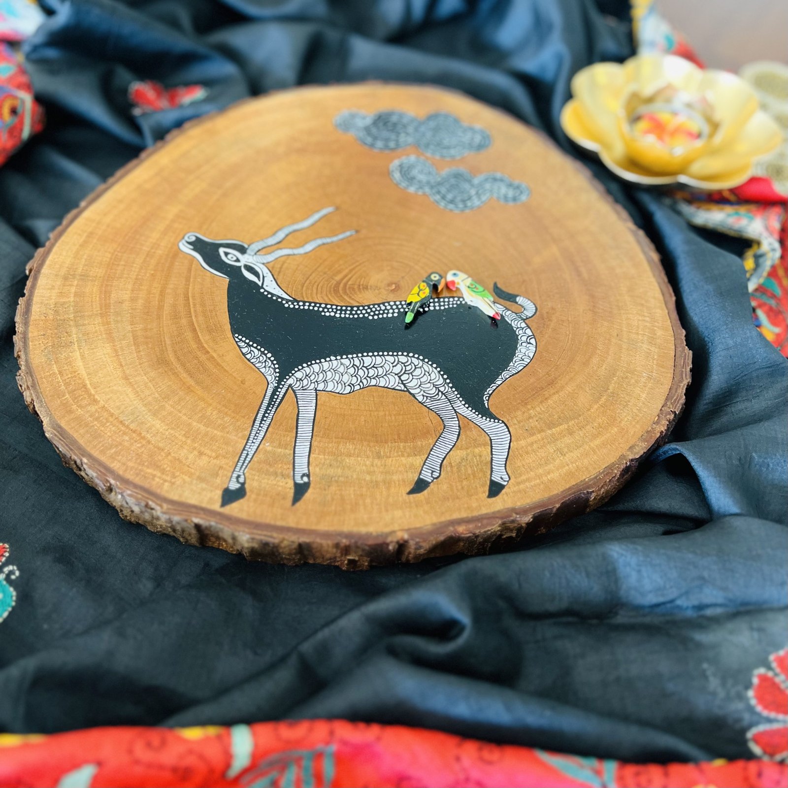 Hand Painted Teak Wood Bark Platter (Deer design)