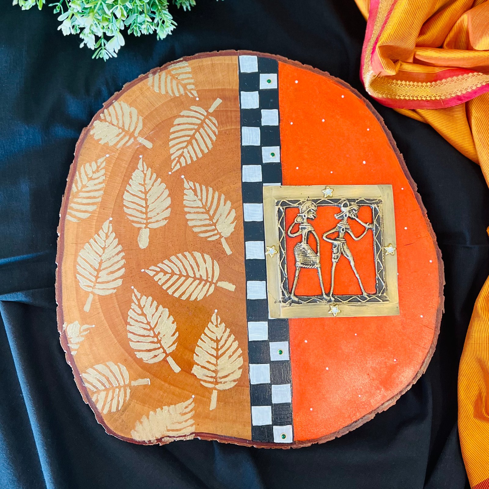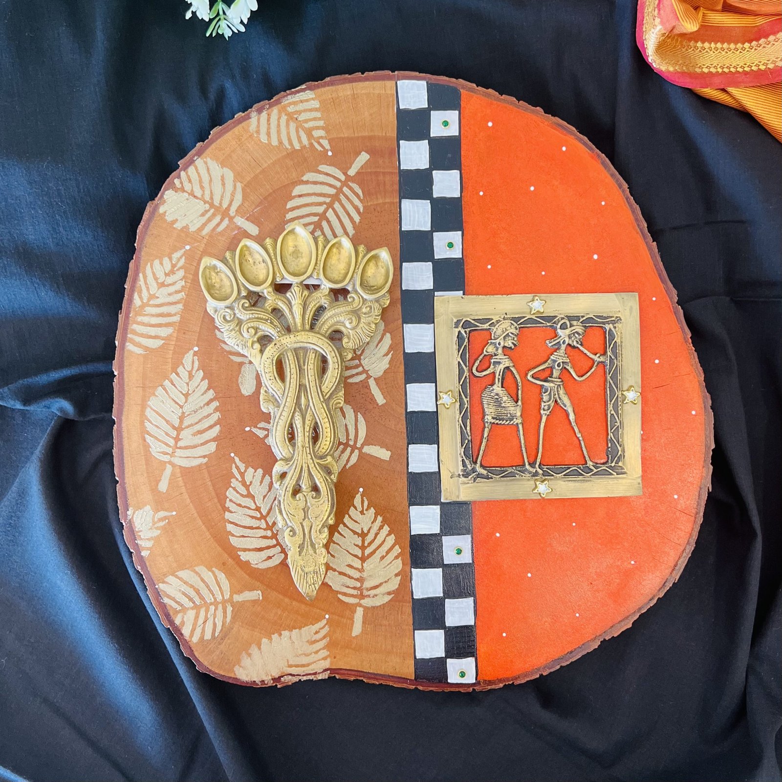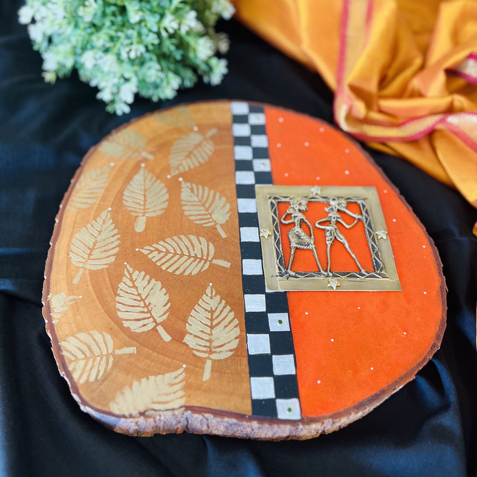 Hand Painted Teak Wood Bark Platter (Dhokra design)