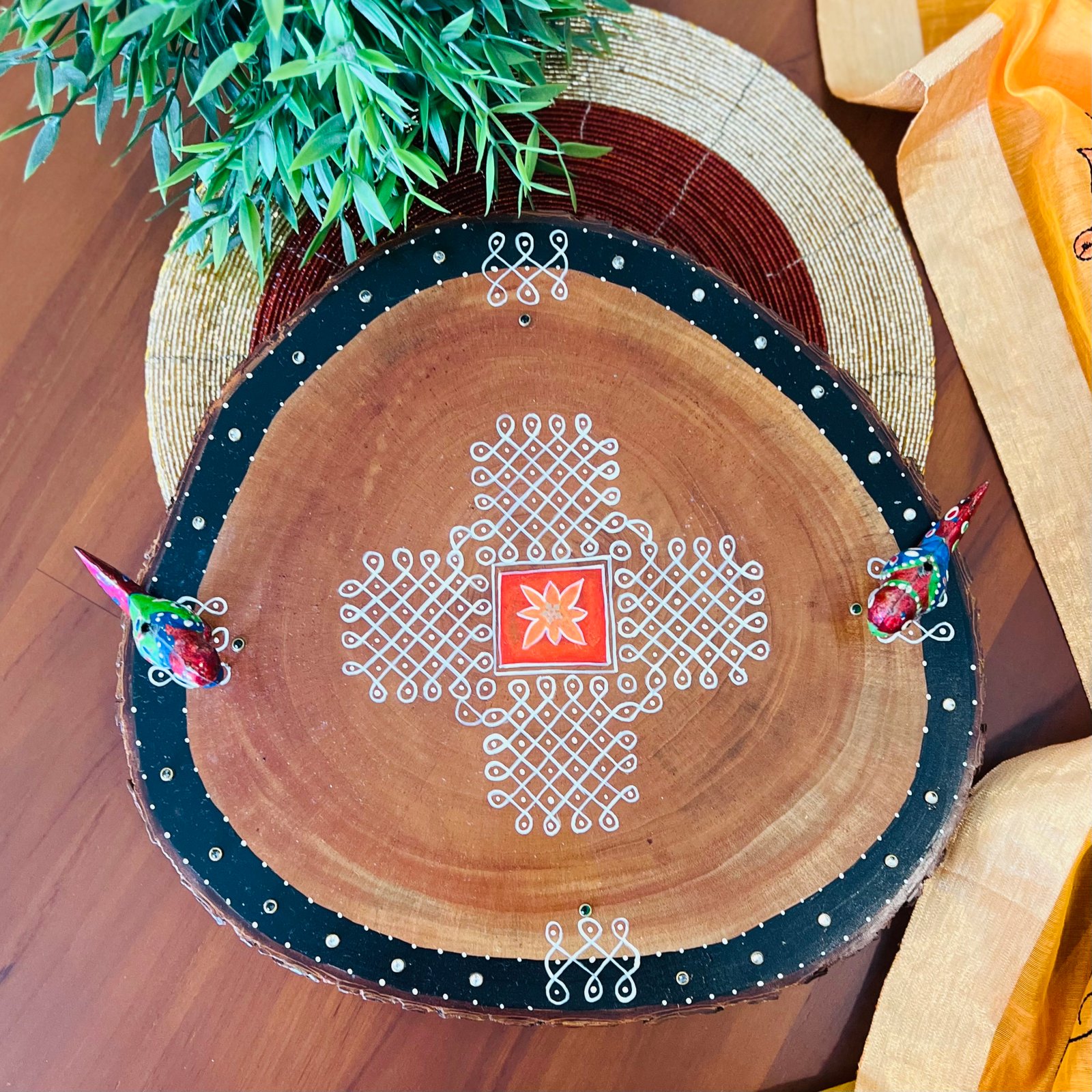 Hand Painted Teak Wood Bark Platter (Standing Birds)