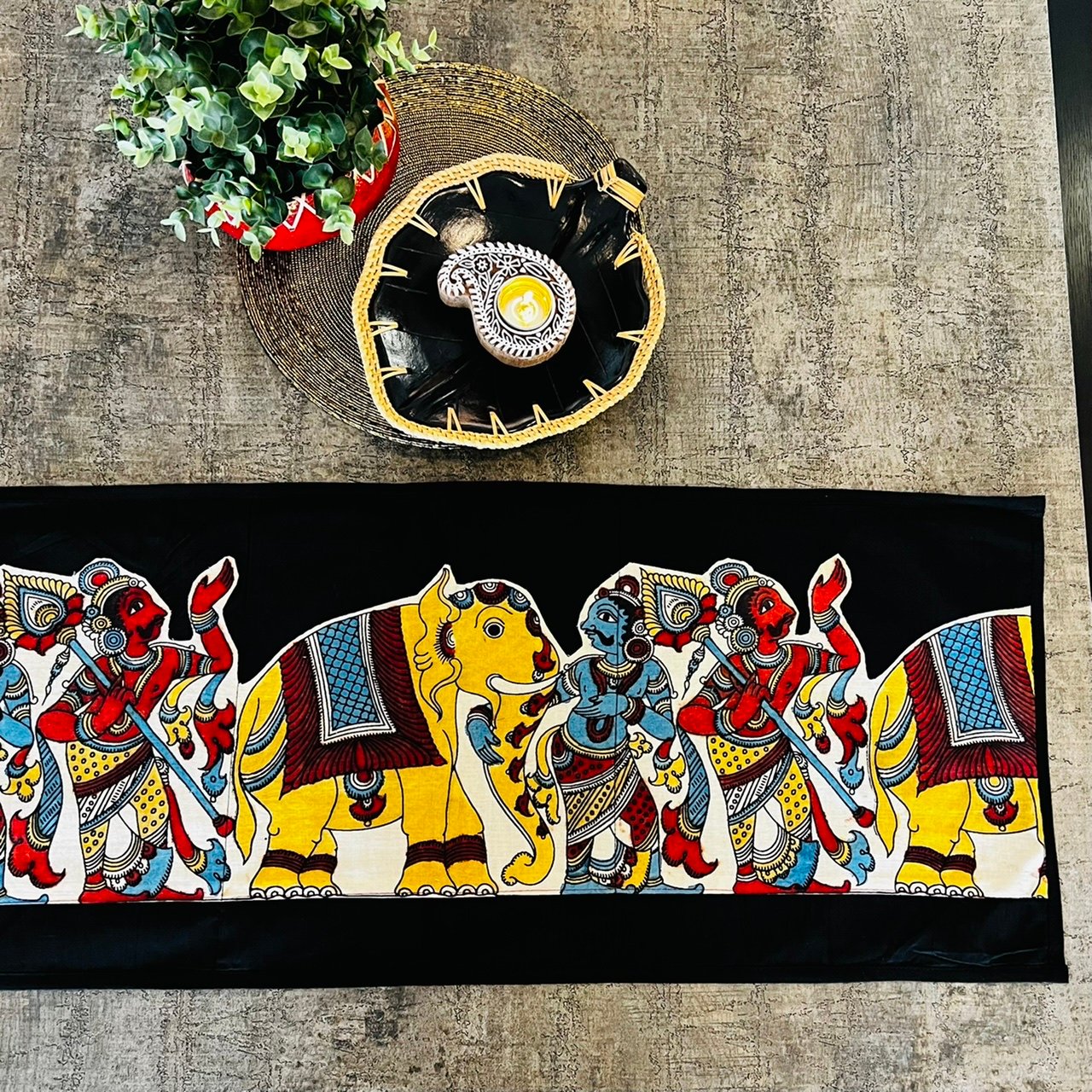 Kalamkari Design Table Runner (Black, Mustard Elephant)