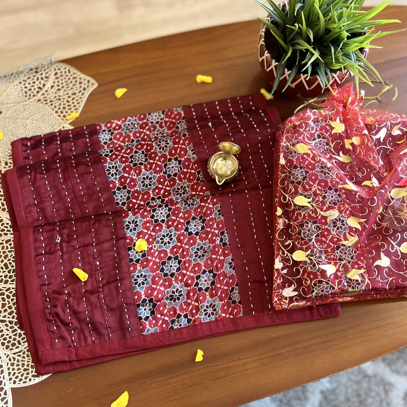 Mashru Silk Table Runner & Diya Gift Set (Red D4)