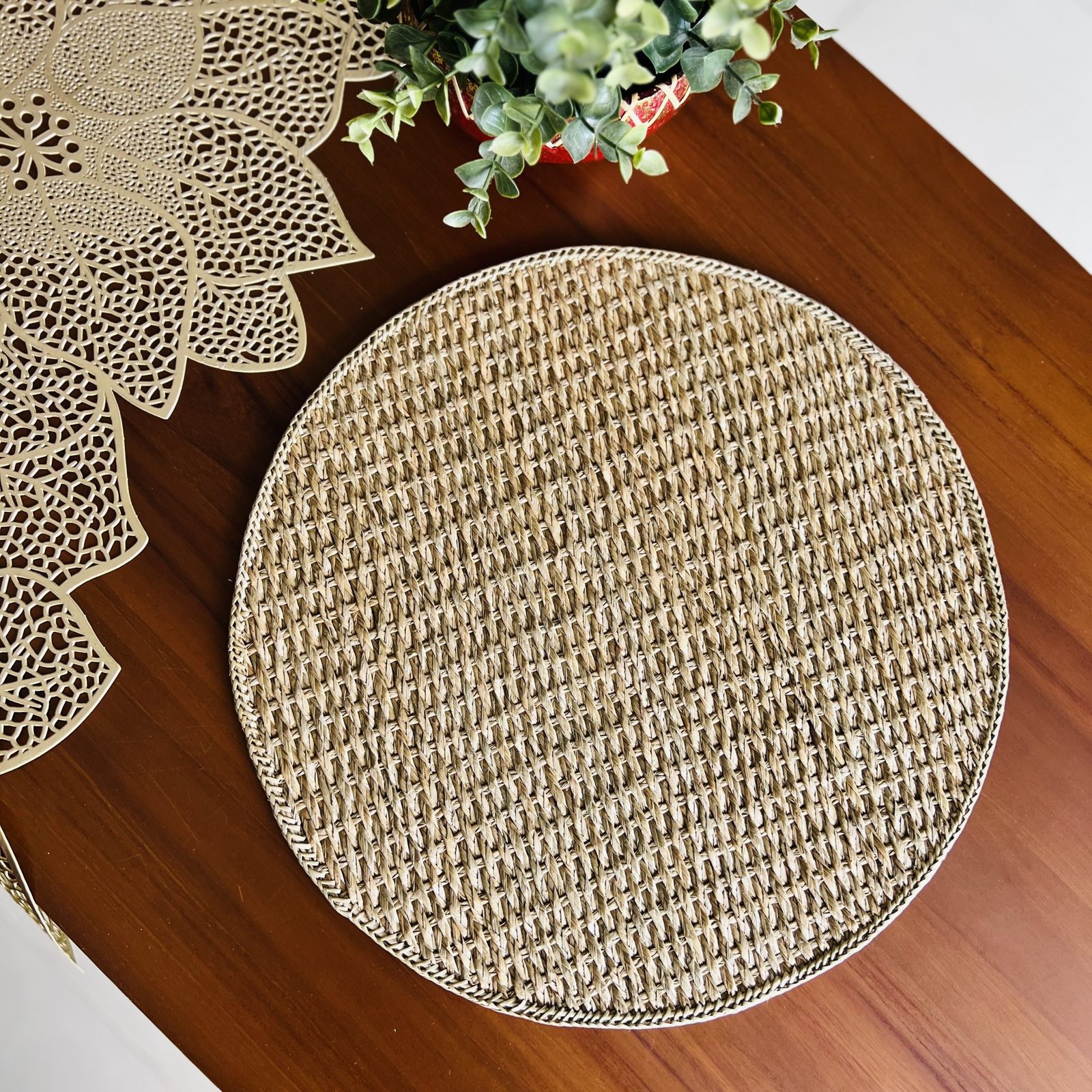 Make a stylish statement by dressing up your dinner tables, patio tables and side boards with our beautiful handmade round woven grass straw placemats. These are woven cross pattern with plaited edge.