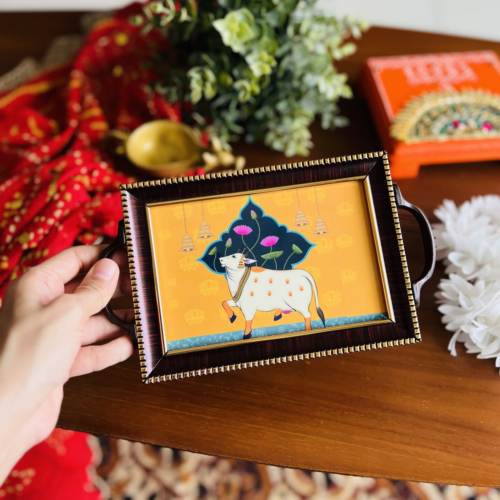 - 1 pichwai design decorative pooja tray – 10×8 inches