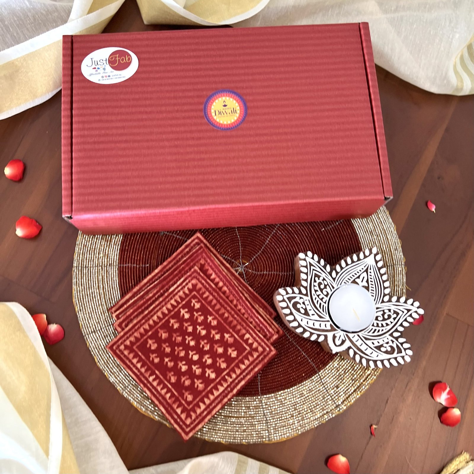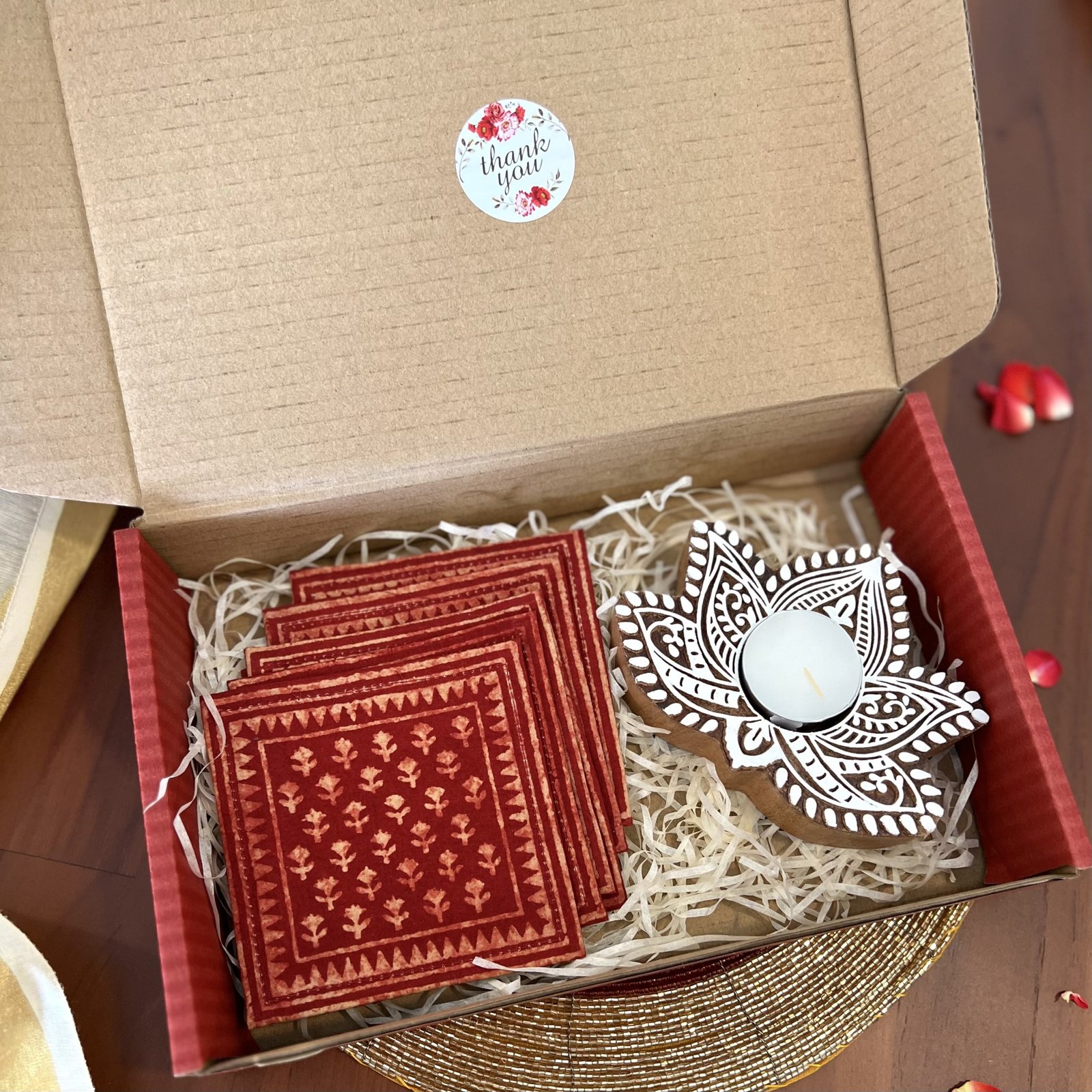 - Assorted Design & Color – Set of 6 Cotton Block Printed Coasters, Size: 10×10 cm.