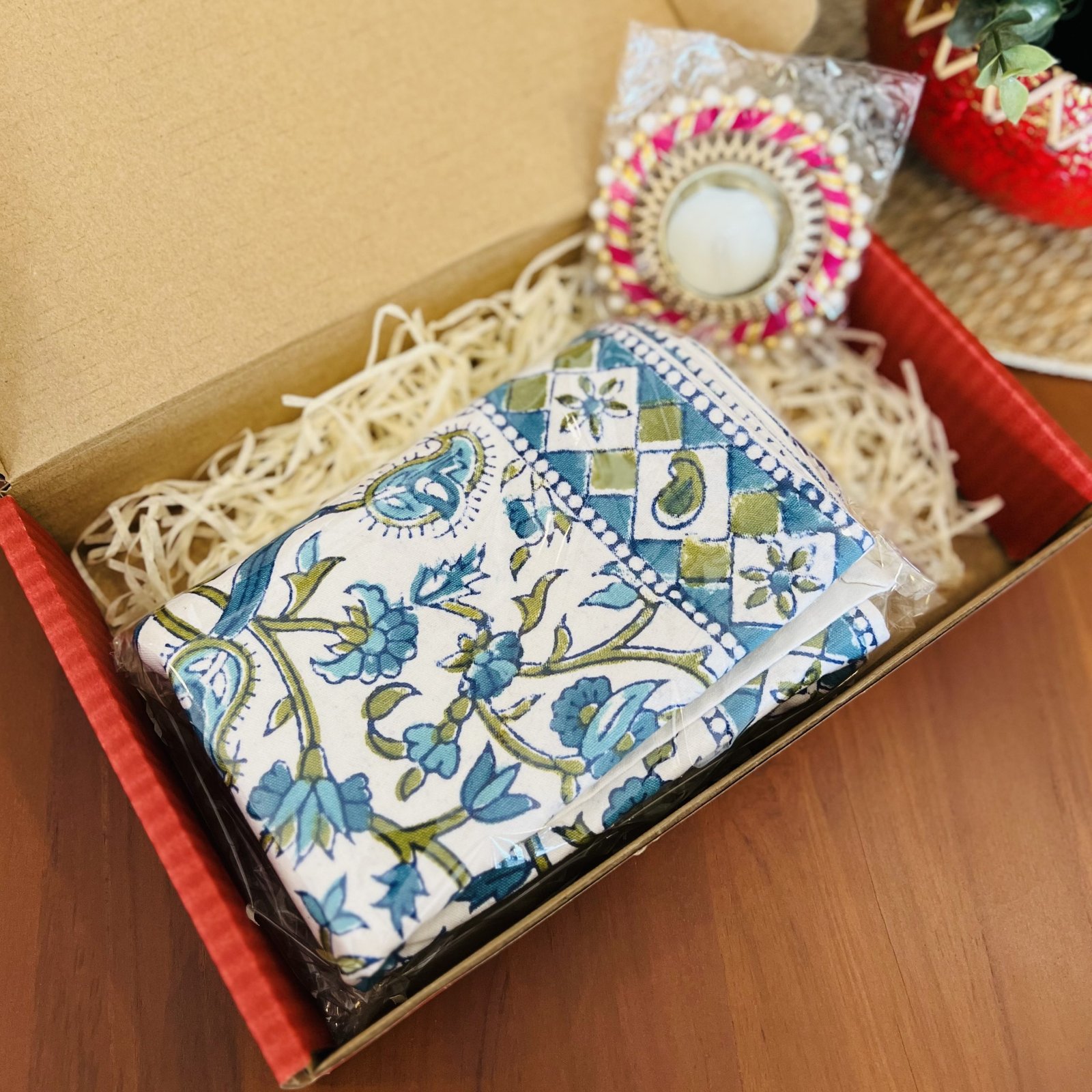 Includes: 1 cotton table runner and 1 festive diya with candle in a gift box. Other combinations of table runner is possible, please message us.