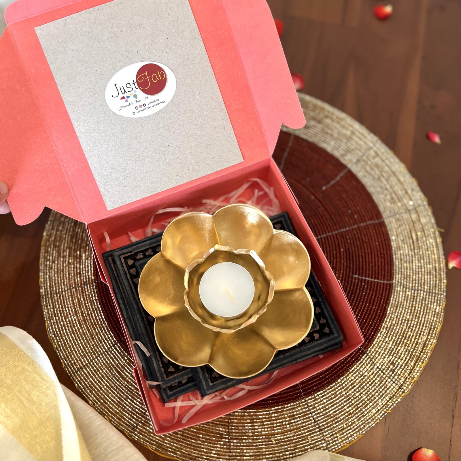 - One metal tealight holder with one wax tealight Size:12cm (Diameter), 3cm Height