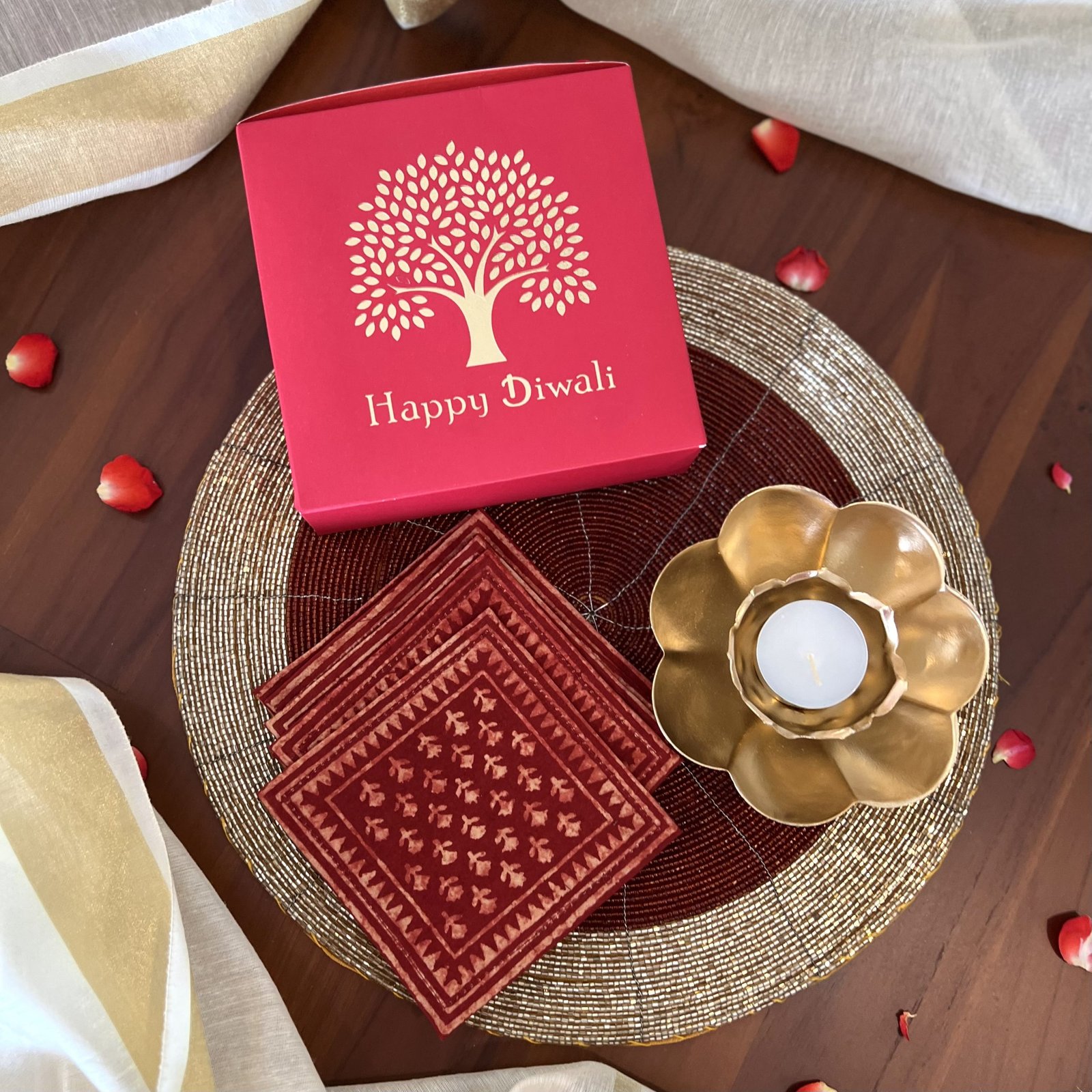 - Assorted Design & Color – Set of 6 Cotton Block Printed Coasters, Size: 10×10 cm.