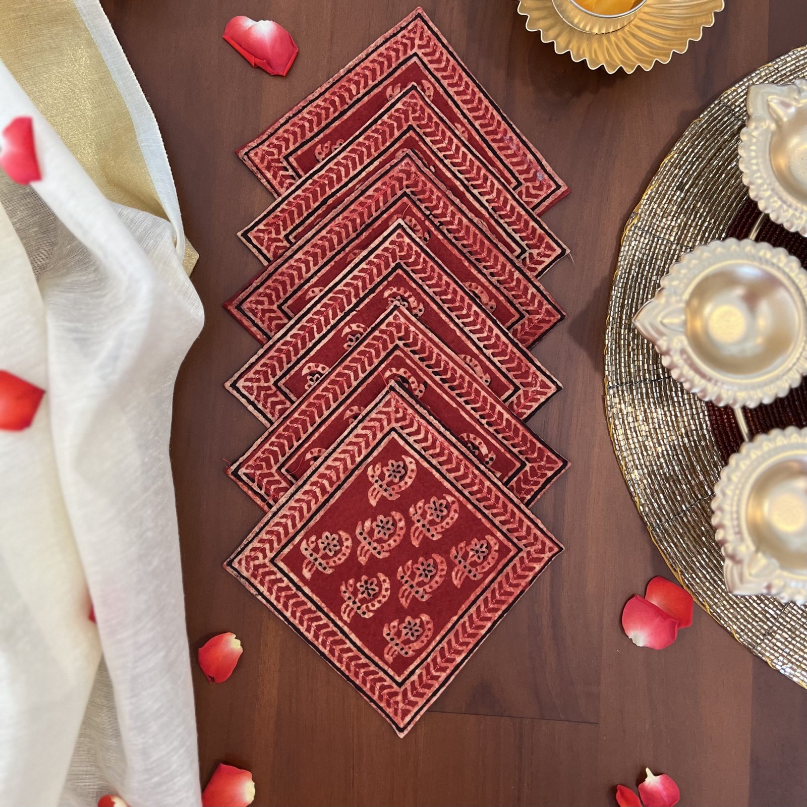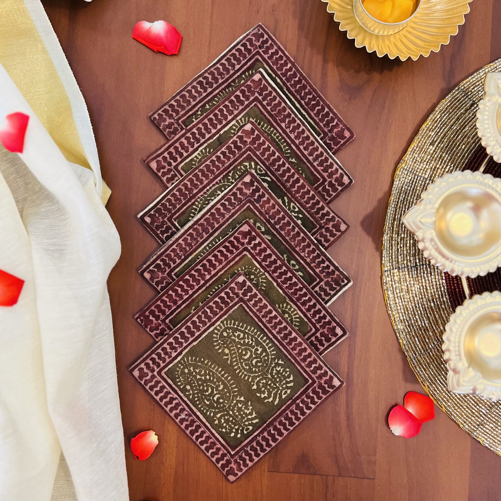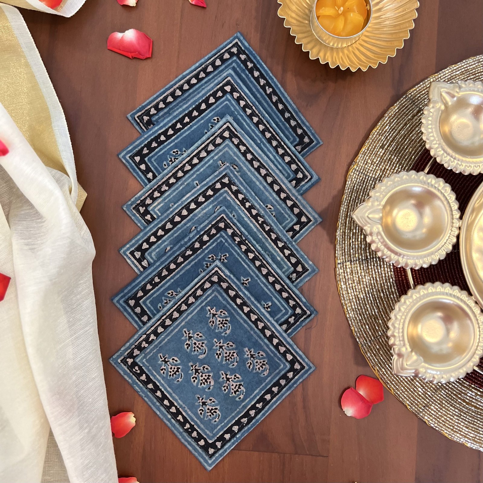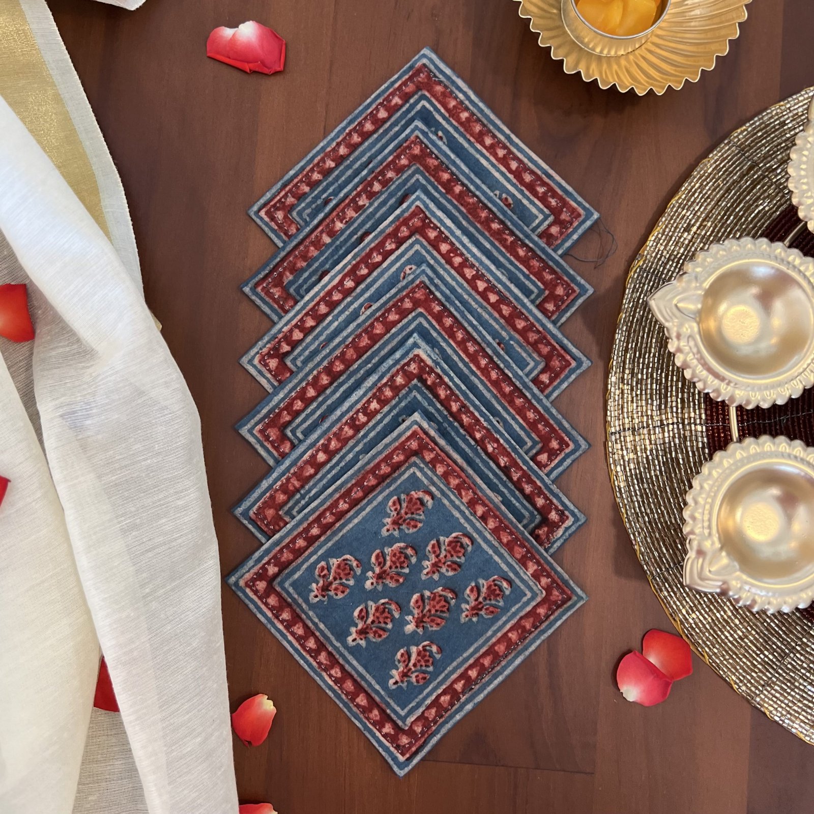 - Assorted Design & Color – Set of 6 Cotton Block Printed Coasters. Size: 10×10 cm.