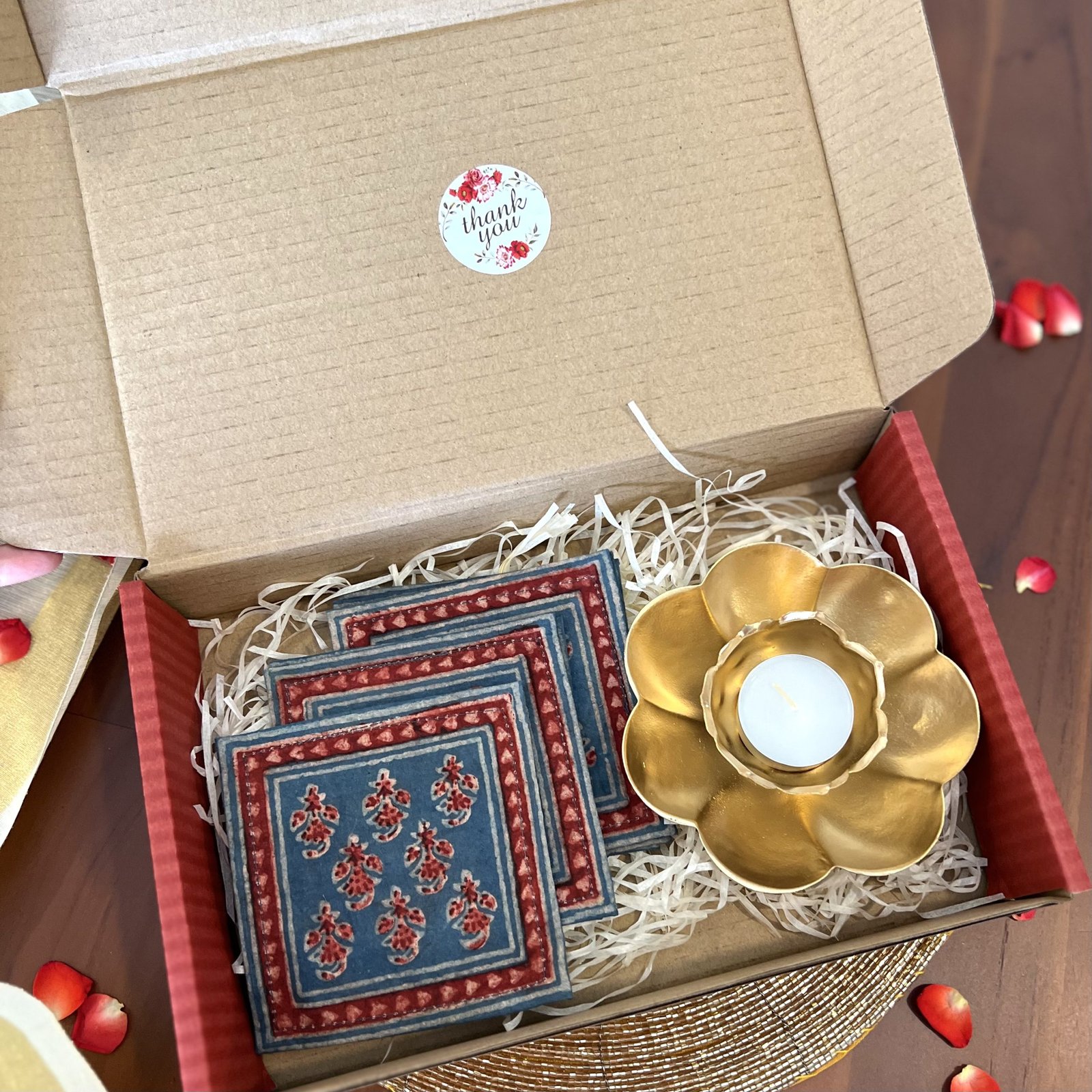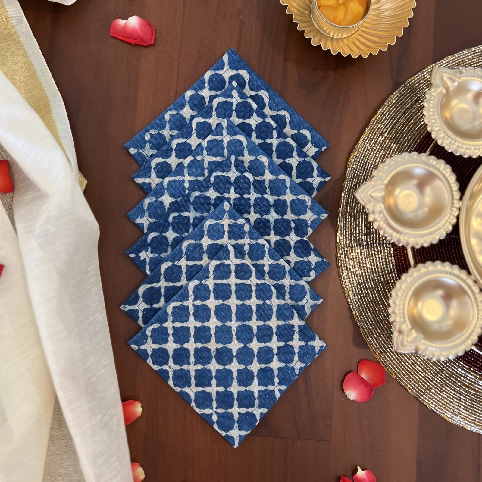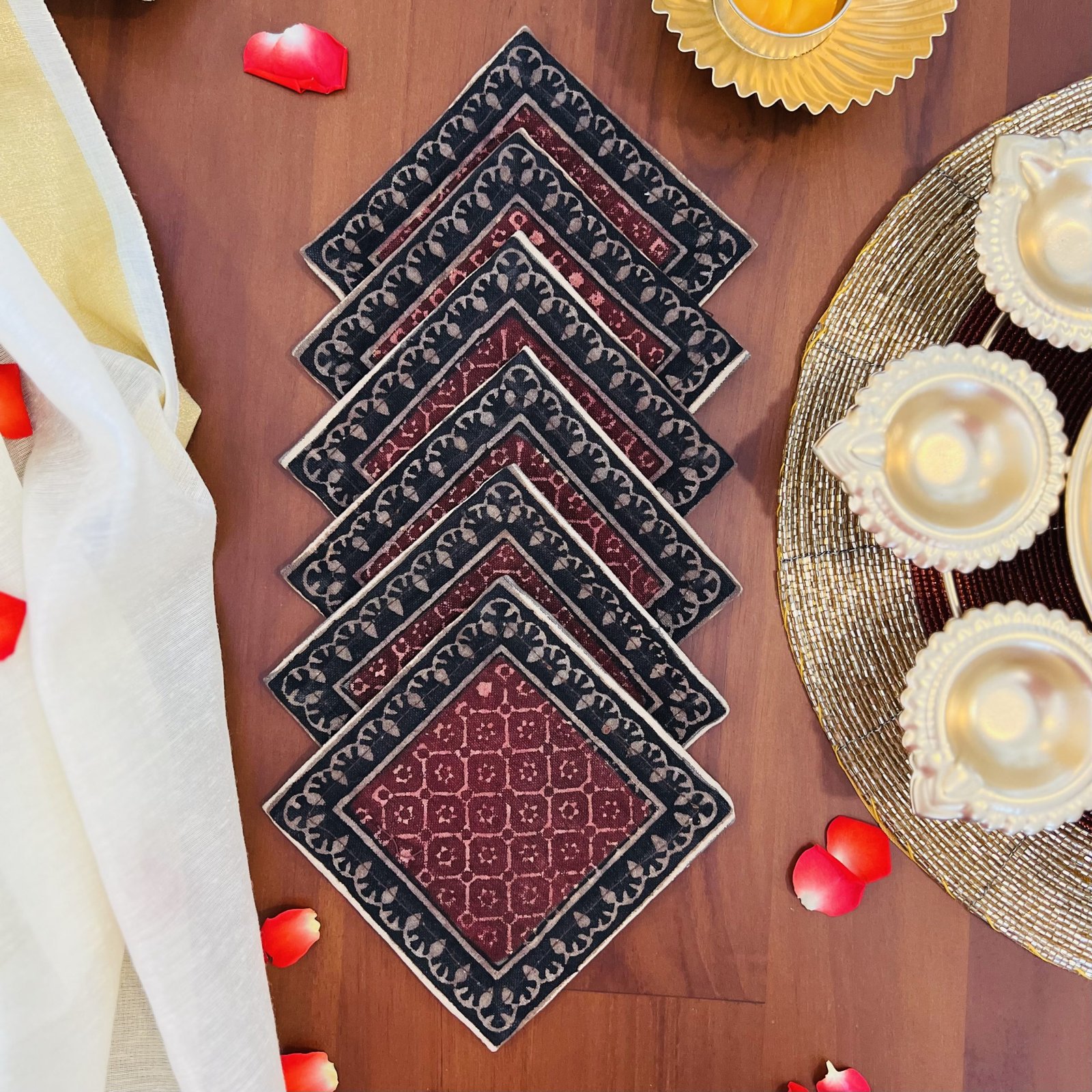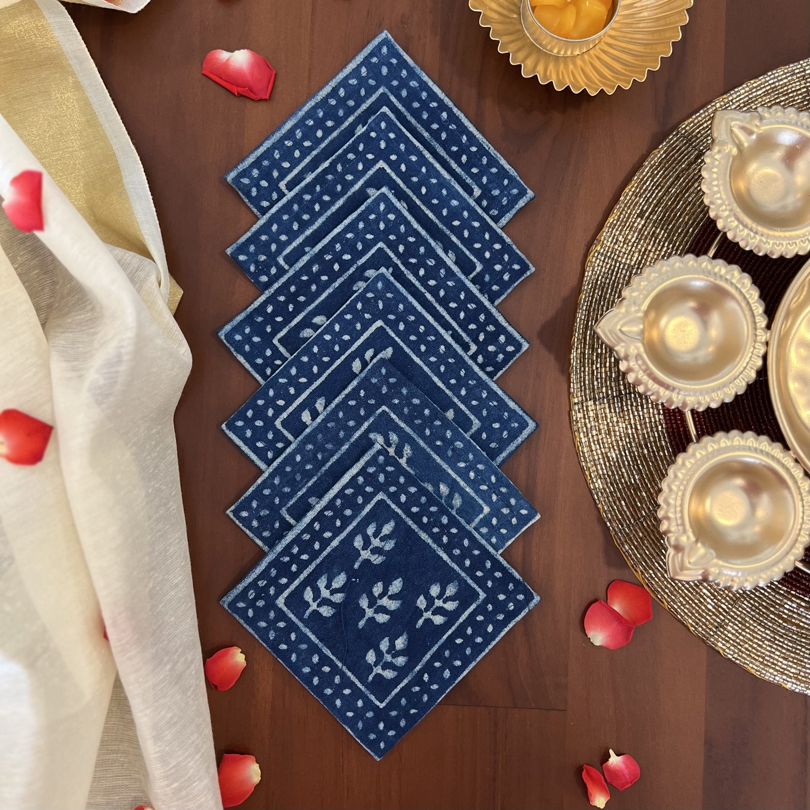 - Assorted Design & Color – Set of 6 Cotton Block Printed Coasters. Size: 10×10 cm.