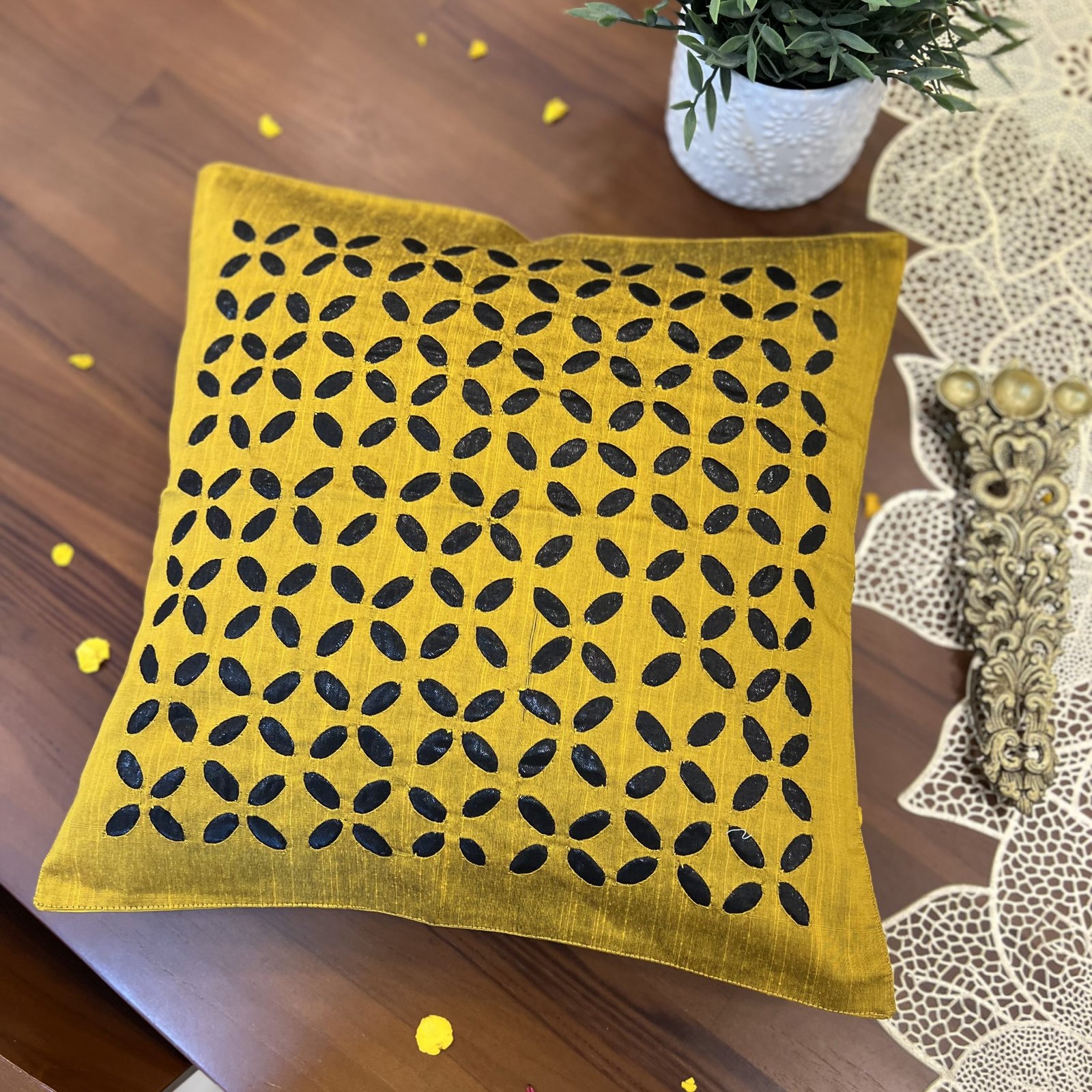 Silk Appliqué Cushion Cover (Mustard)