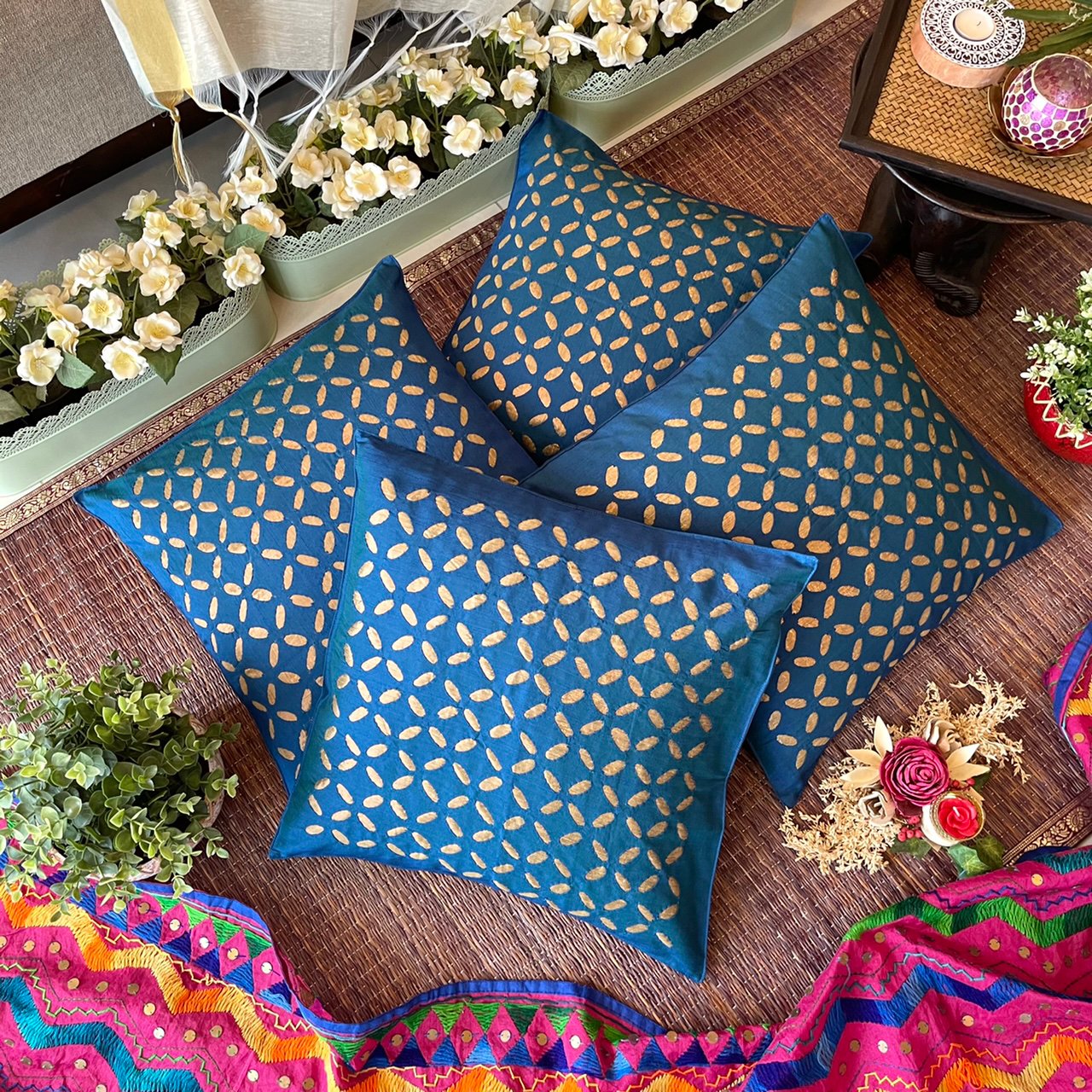 Silk Appliqué Cushion Covers (Set of 4, Blue)