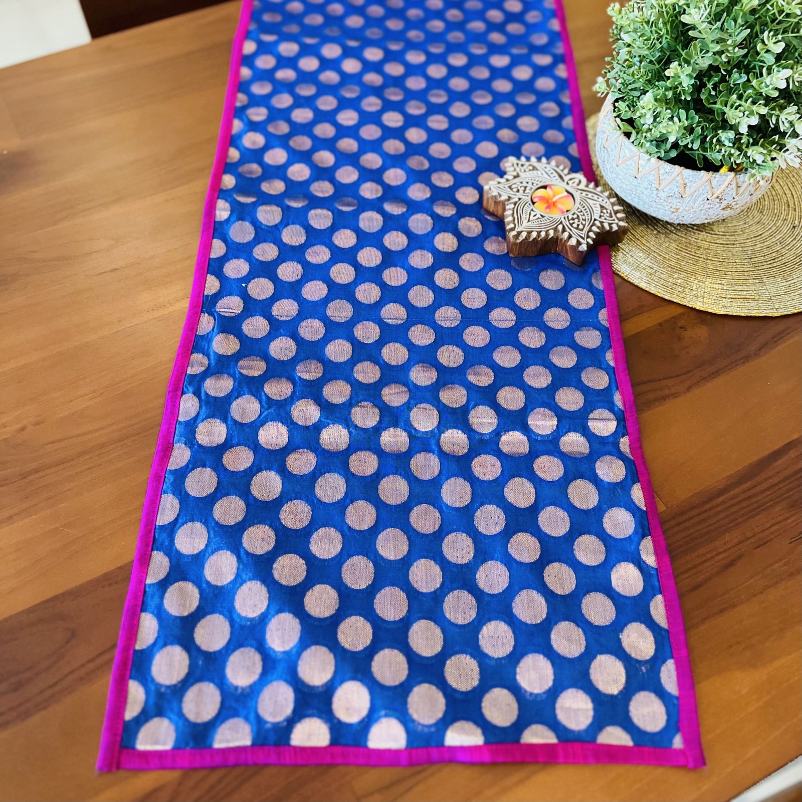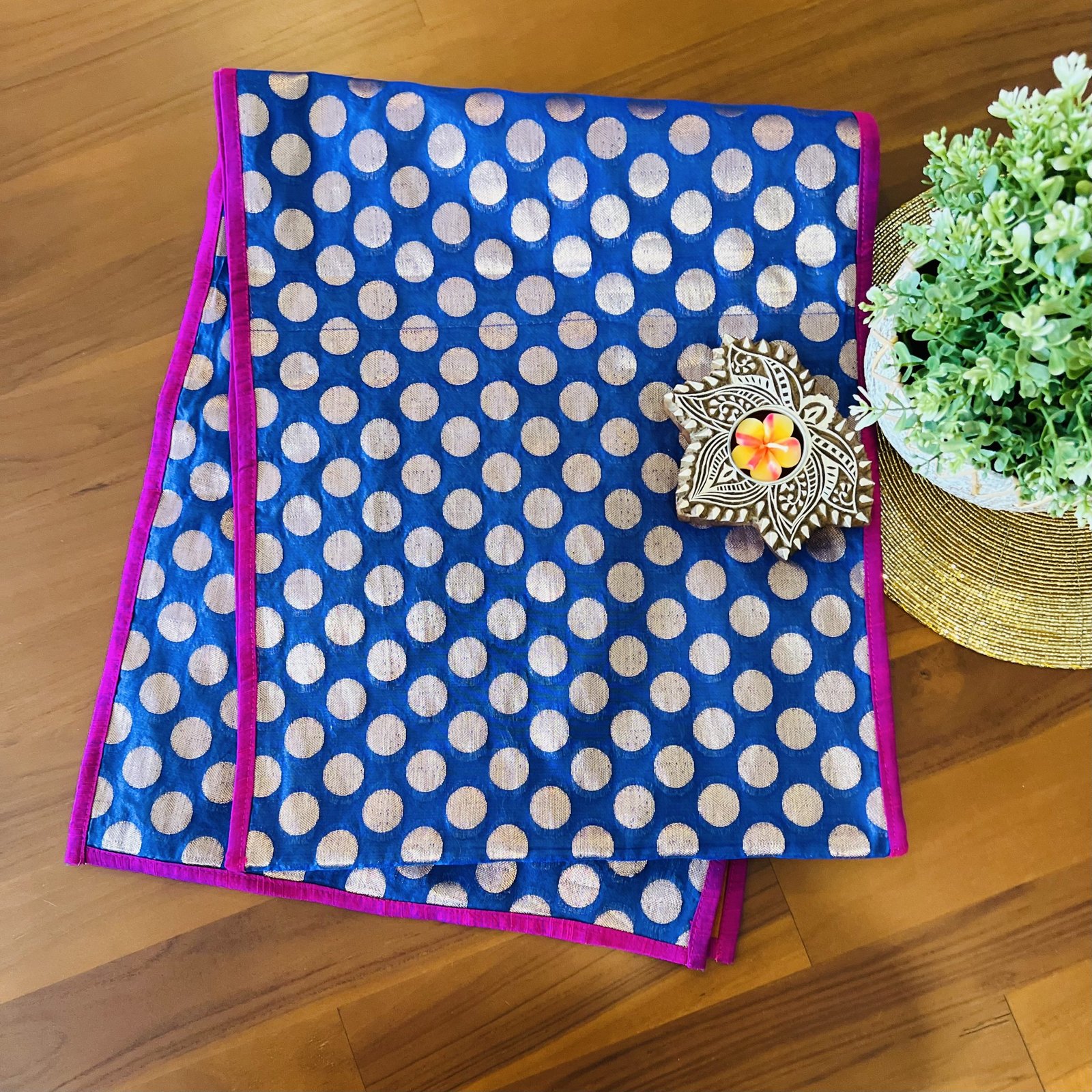 Silk Table Runner & Brass Diya Gift Set (Dots)