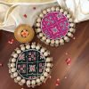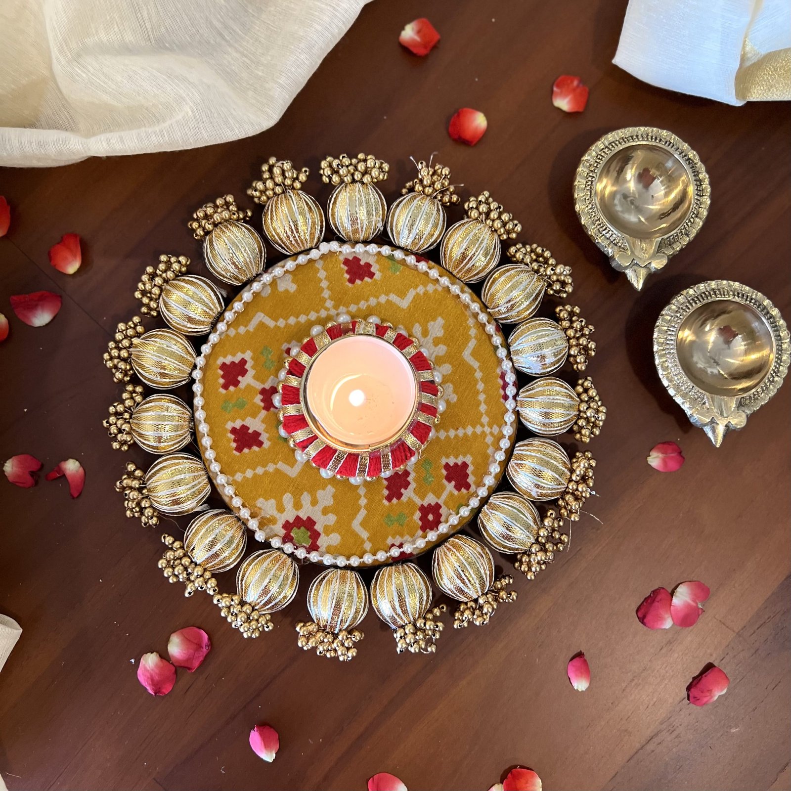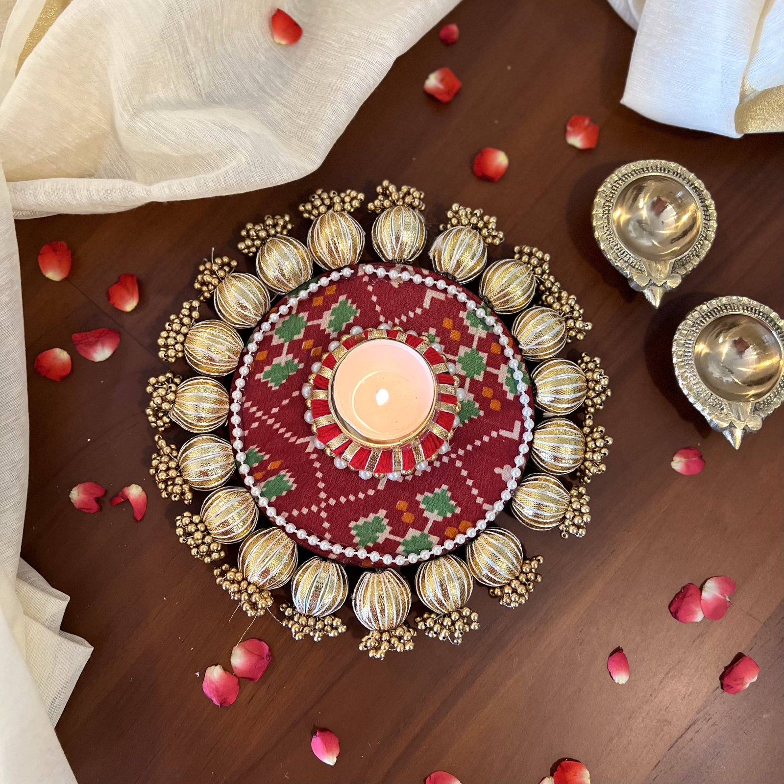 Note: Usable both sides with red design on one side and mustard design on the other side. Includes only one patola silk mat, diya and other accessories are not included.