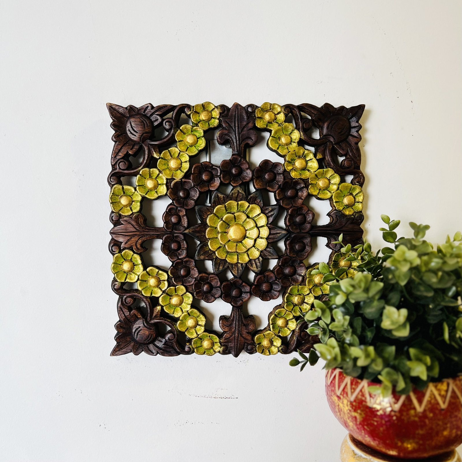 Teak Wood Carved Panel (Green Gold, 30x30cm)