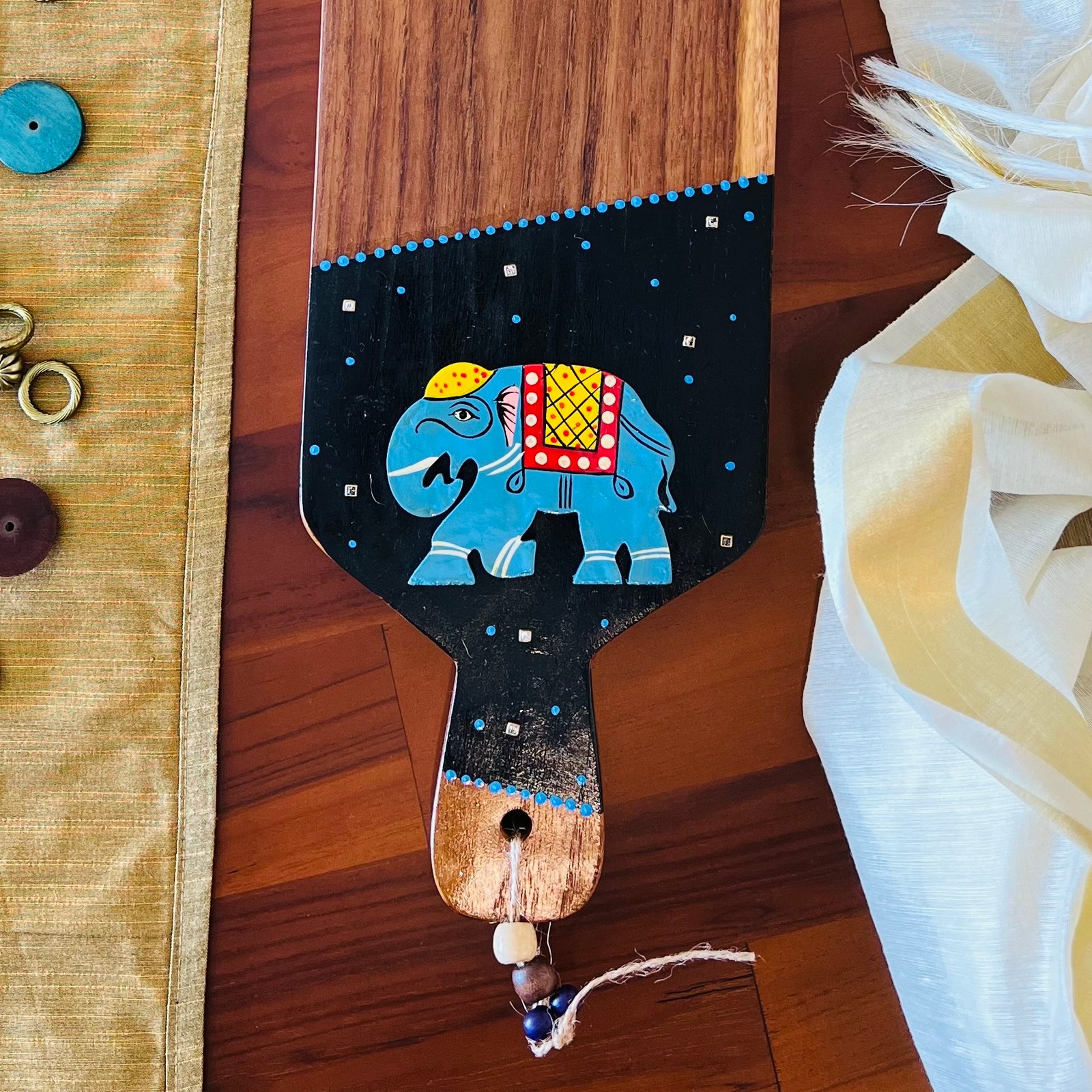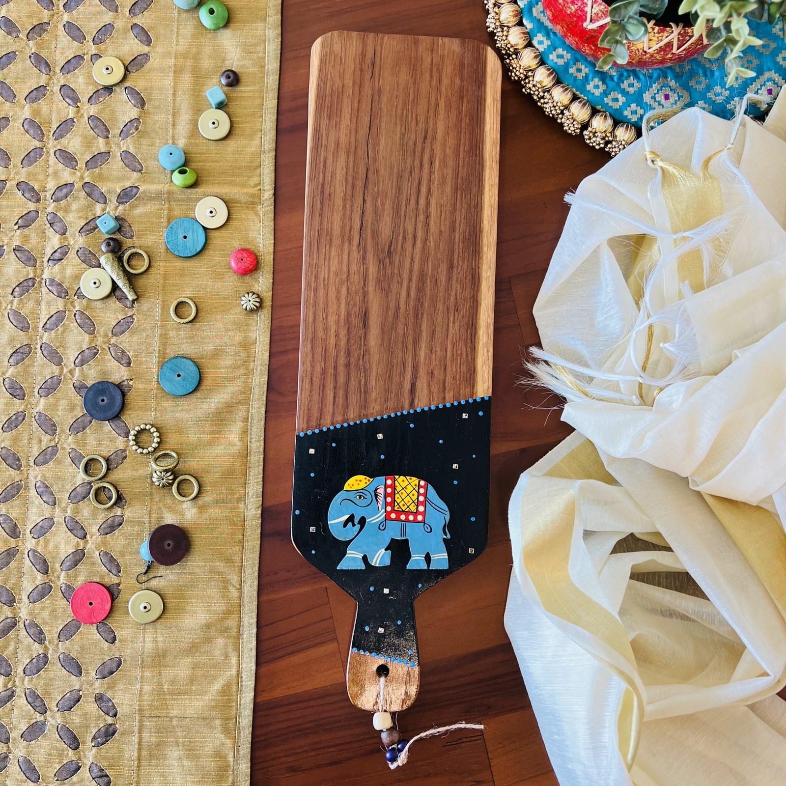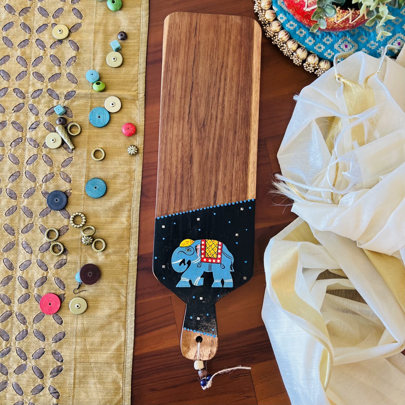 Teak Wood Platter (Medium Rectangle, Blue Elephant Design)
