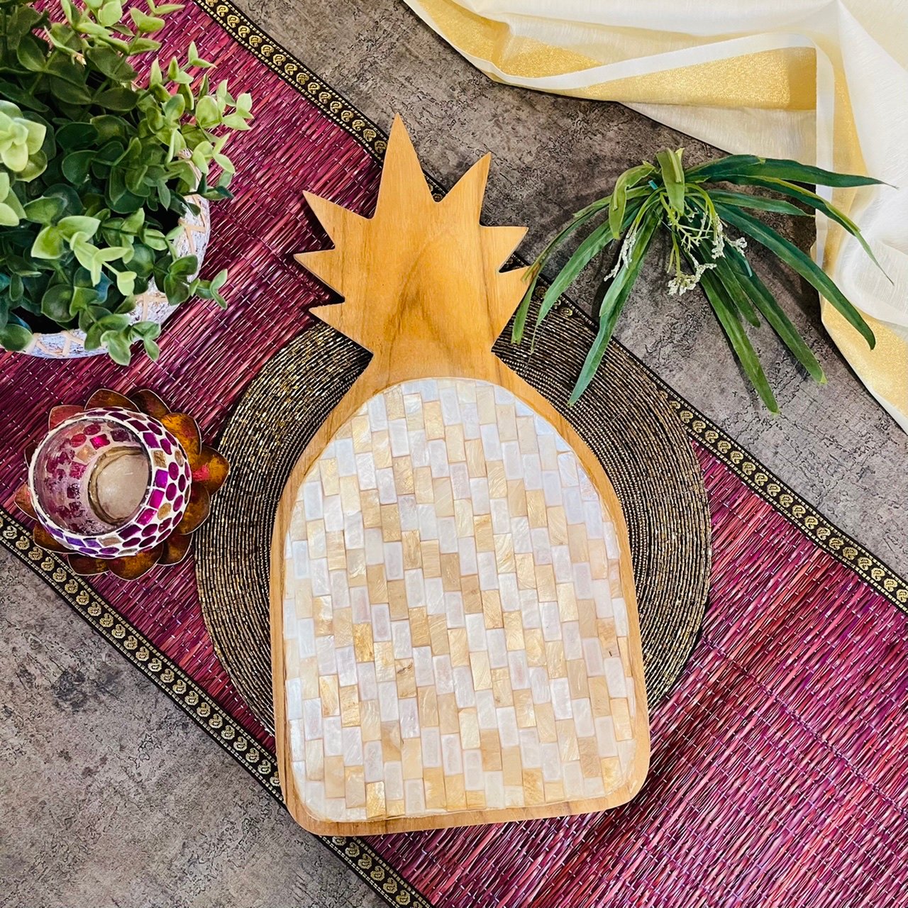 Wooden Pineapple Shaped Platter (White&Gold Checked)